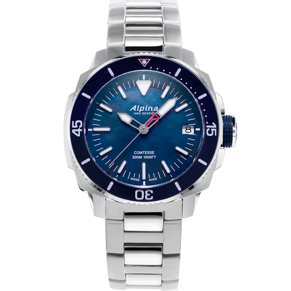 Годинник для дайвінгу Alpina, об'єднаний в колекцію Seastrong, є міцним і легко читаним годинником. Розроблені для любителів водних видів спорту ці моделі увічнюють горду традицію бренду, закладену в минулому столітті. Більшість моделей має 300-метровий водозахист.
