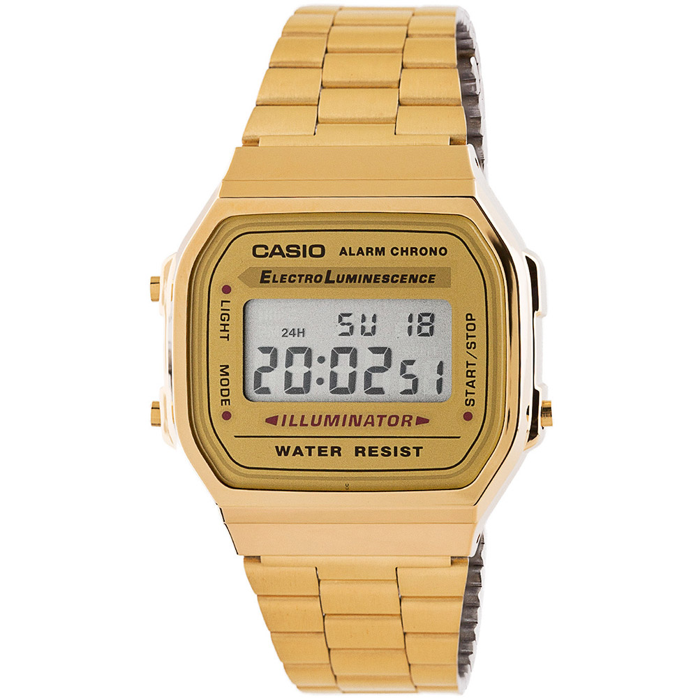 Електронні Casio Retro A168WG-9EF мають пластиковий корпус та акрилове скло. Регульований браслет зроблений з нержавіючої сталі, золотий колір виходить завдяки спеціальному нанесенню покриття. Є електролюмінесцентне підсвічування, секундомір, будильник.