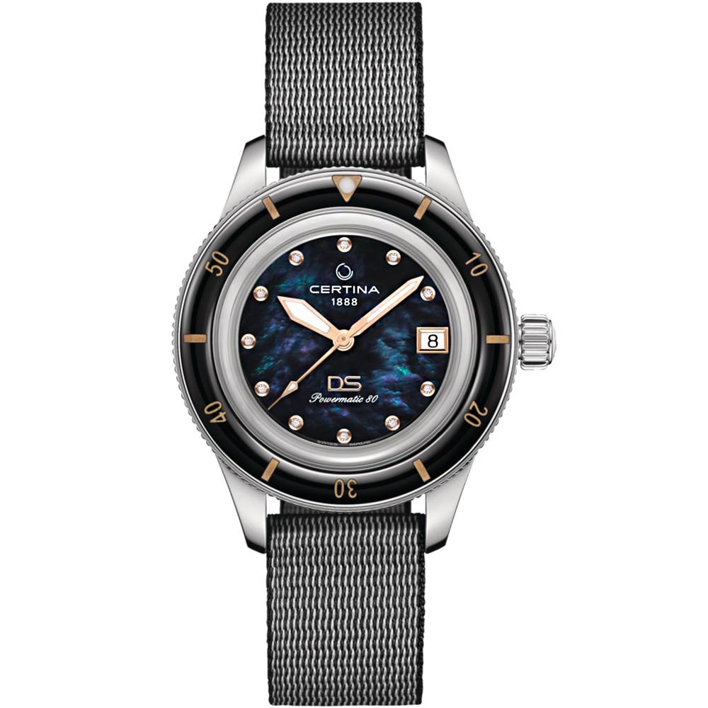 Є індикатор дати, однонаправлений безель, що обертається, заводна голівка, що загвинчується, прозора задня кришка корпусу, що загвинчується. Мітки інкрустовані діамантами, циферблат із натурального перламутру. Люмінесцентний склад Super-LumiNova® на стрілках дозволяє легко зчитувати час у будь-який час доби.