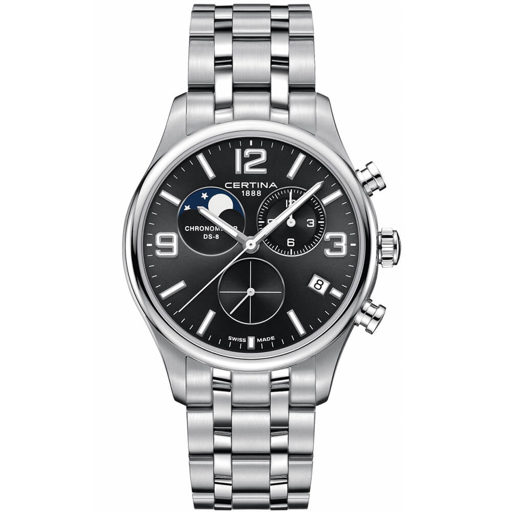 Є індикатор дати, покажчик фази місяця, хронограф. EOL (end of life) – індикатор терміну служби батарейки.