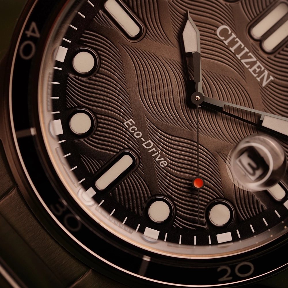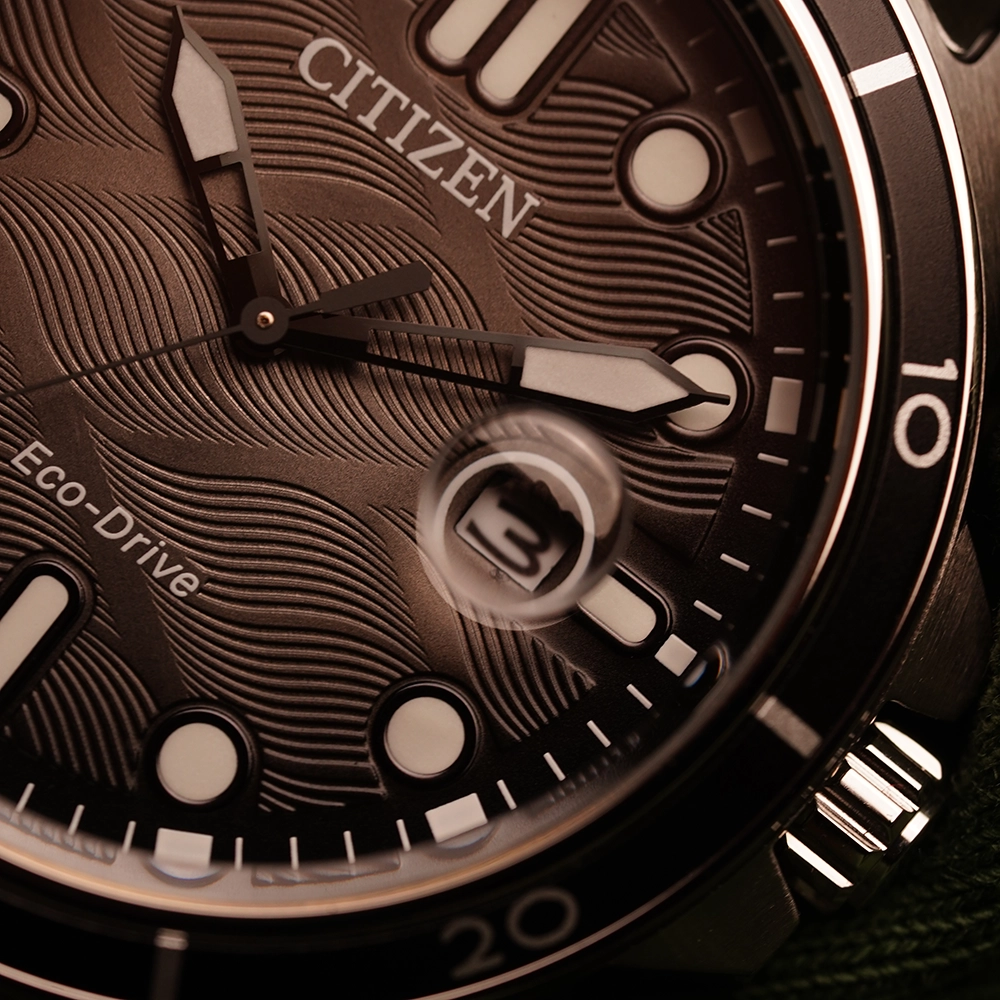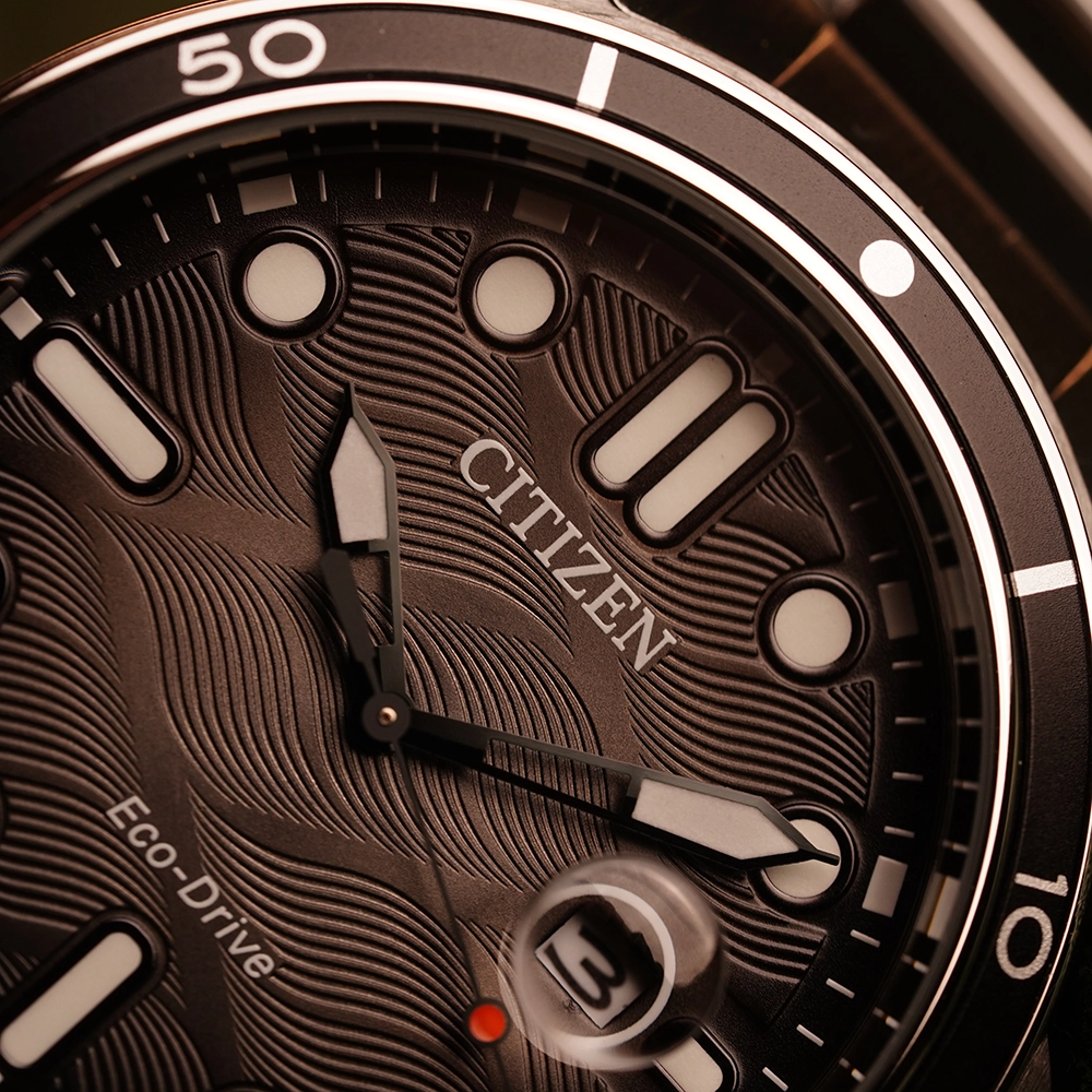 В годиннику встановлений механізм Eco-drive J810. Працює від будь-якого джерела світла, безперервно та стабільно, що усуває необхідність заміни батареї. Запас ходу складає 240 днів. Є апертура дати.