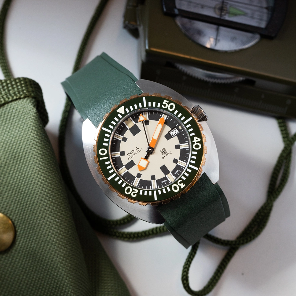 DOXA Army продовжує естетику дизайну оригіналу SUB 300, додаючи сучасності та продуктивності. Спеціальний футляр годинника прикрашений оригінальним камуфляжем польової форми, яку на той час носила швейцарська армія.