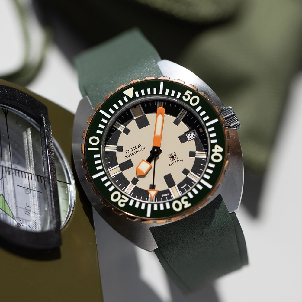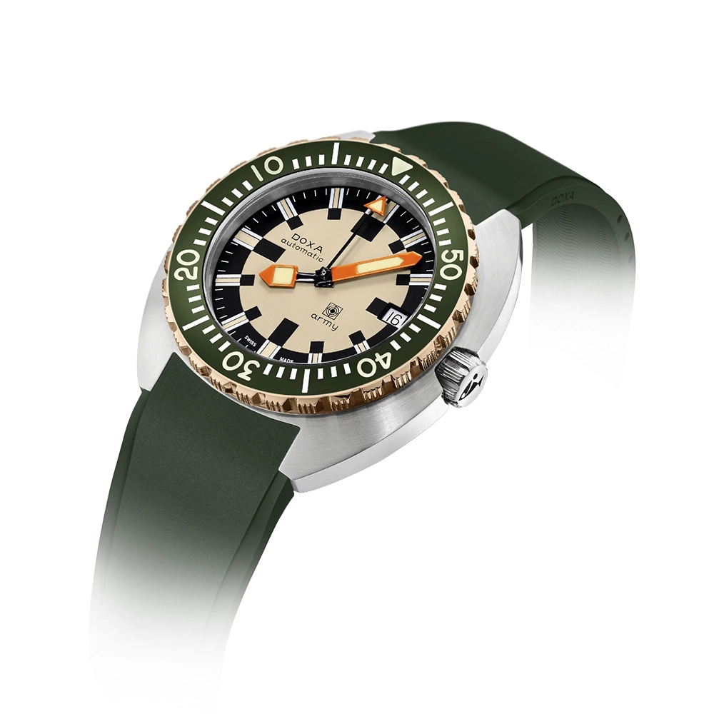 DOXA Army оснащений бронзовим однонаправленим безелем, що обертається, з керамічною вставкою. Водонепроникність годинника із заводною головкою, що загвинчується, становить 300 метрів.