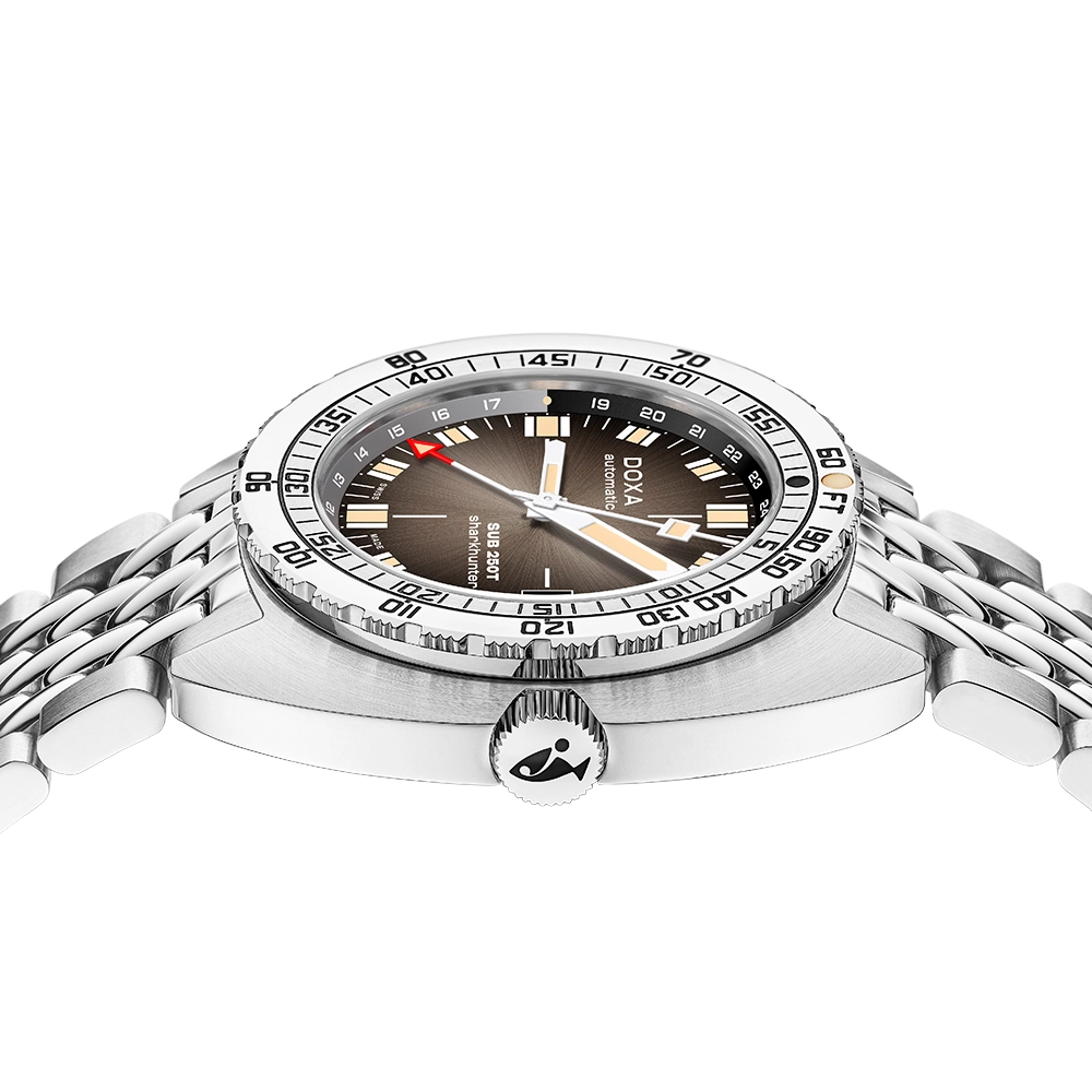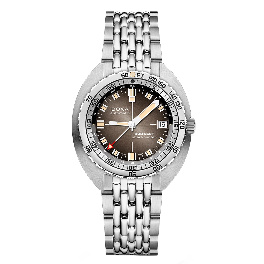 SUB 250T GMT Sharkhunter із градієнтним циферблатом – перший для DOXA. Заворожуюча данина першим моделям Sharkhunter з їх повністю білими стрілками, витончена ретро-естетика нагадує новаторську епоху DOXA у професійному дайвінгу.