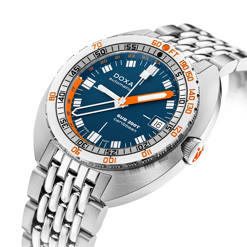 SUB 250T GMT продовжує характерну мову дизайну DOXA SUB у новому сучасному корпусі 40 мм. Присутня кожна важлива деталь: запатентований односпрямований безель зі шкалою для занурення, заводна головка, що загвинчується, і водонепроникність до 25 ATM (250 метрів/~820 футів). Від занурення до польоту, він готовий до будь-яких викликів.