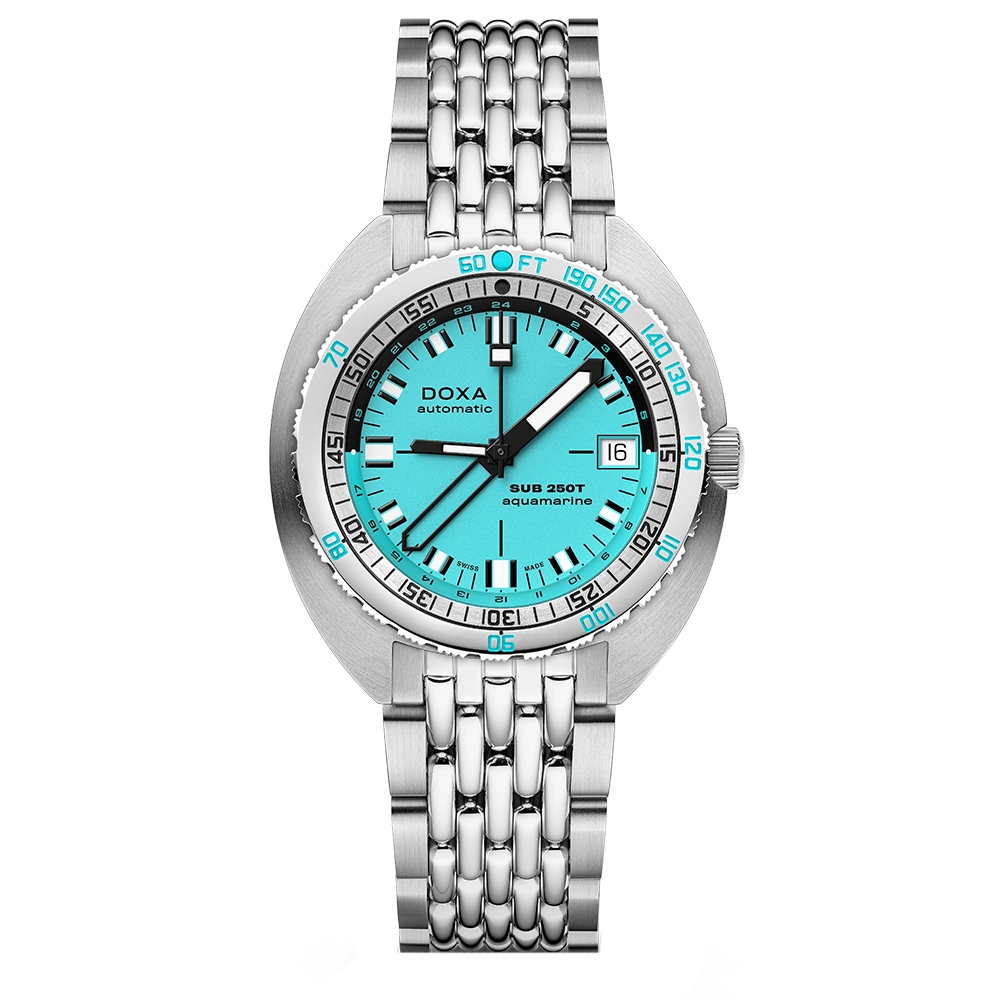 SUB 250T GMT продовжує характерну мову дизайну DOXA SUB у новому сучасному корпусі 40 мм. Присутня кожна важлива деталь: запатентований односпрямований безель зі шкалою для занурення, заводна головка, що загвинчується, і водонепроникність до 25 ATM (250 метрів/~820 футів). Від занурення до польоту, він готовий до будь-яких викликів.