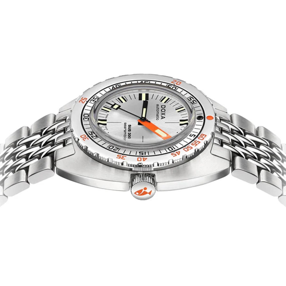 SUB 300 звісно ж оснащений знаменитим однонаправленим безелем, що обертається, запатентованим DOXA, з подвійною індикацією часу занурення в хвилинах і глибини в метрах для розрахунку часу занурення з безупинною декомпресією. Водонепроникність годинника із заводною головкою, що загвинчується, становить 300 метрів.