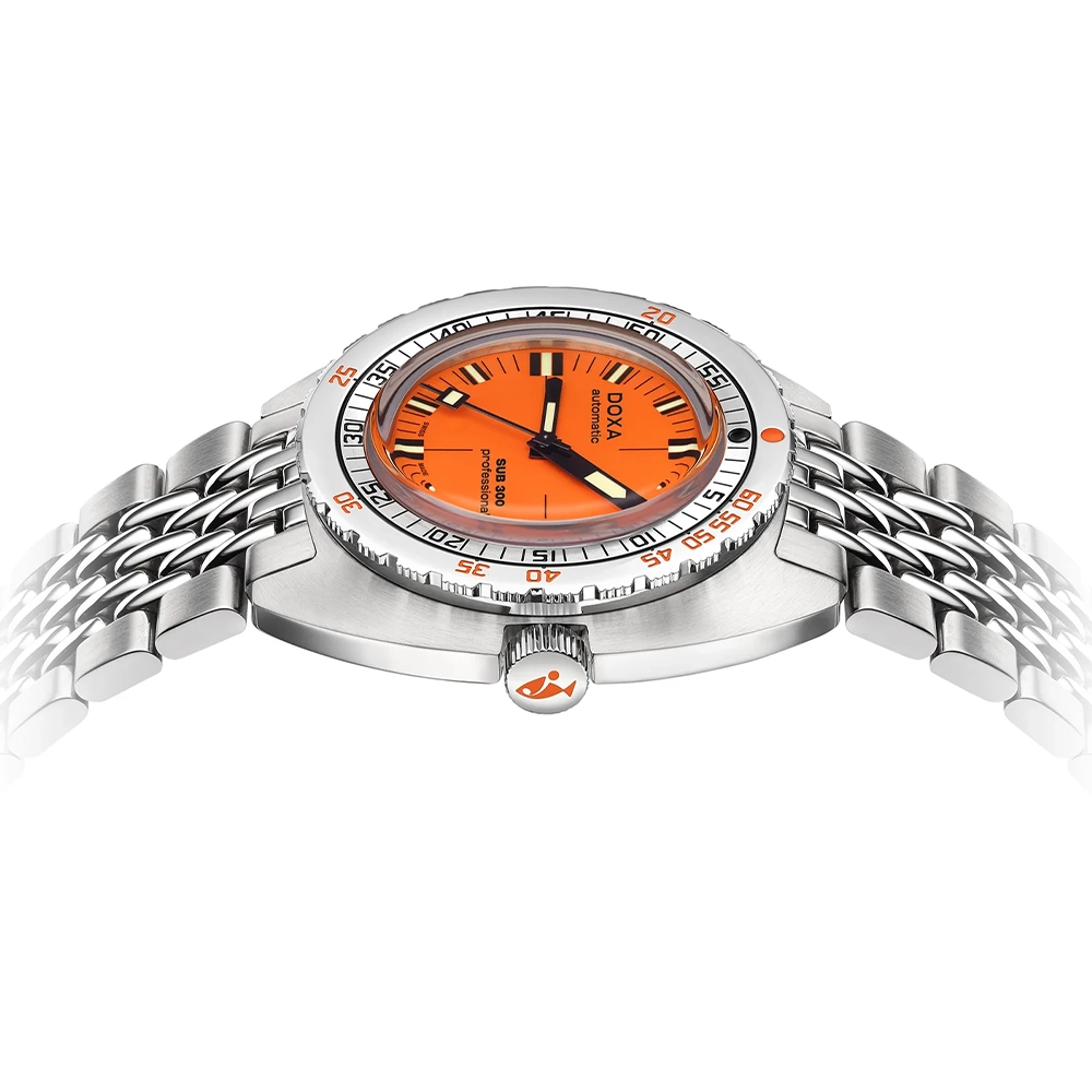 SUB 300 звісно ж оснащений знаменитим однонаправленим безелем, що обертається, запатентованим DOXA, з подвійною індикацією часу занурення в хвилинах і глибини в метрах для розрахунку часу занурення з безупинною декомпресією. Водонепроникність годинника із заводною головкою, що загвинчується, становить 300 метрів.