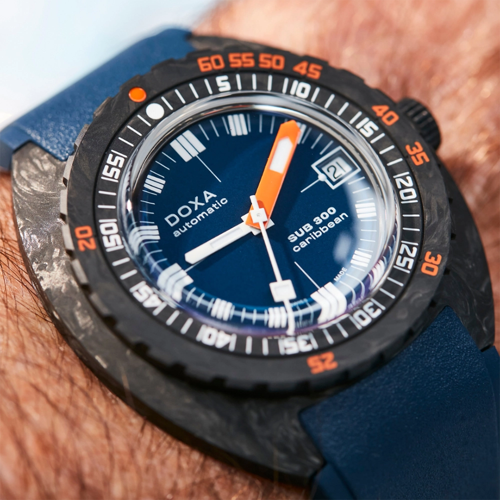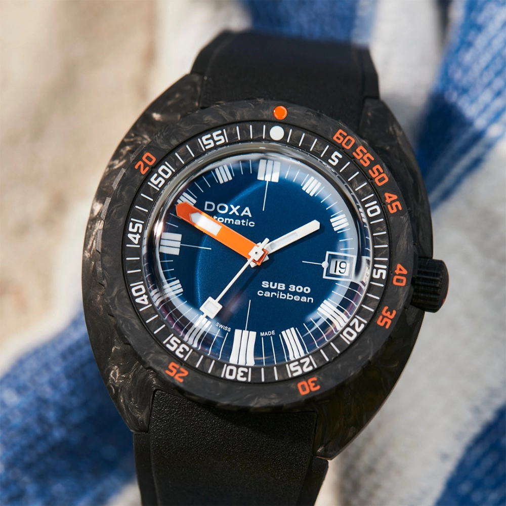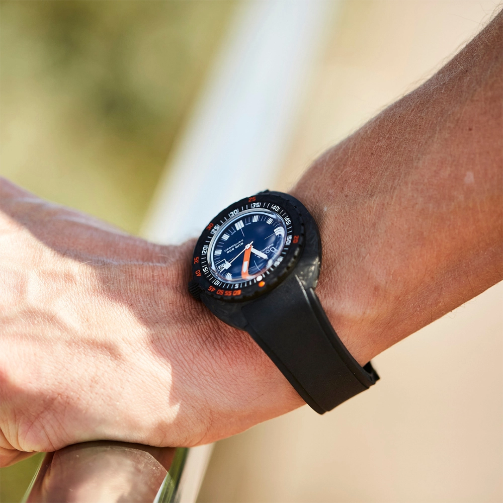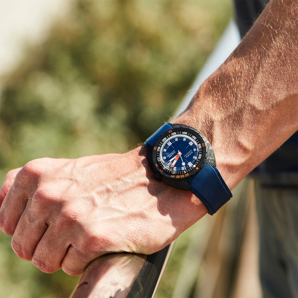 Каучуковий ремінець з характерними символами DOXA з обох боків оснащений застібкою, що розкладається, з чорним PVD-покриттям, прикрашеною символом риби DOXA. Він також має регульований подовжувач для гідрокостюма.