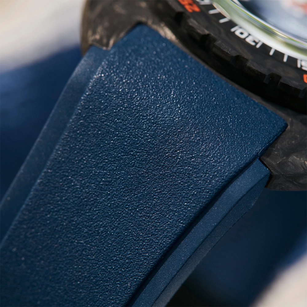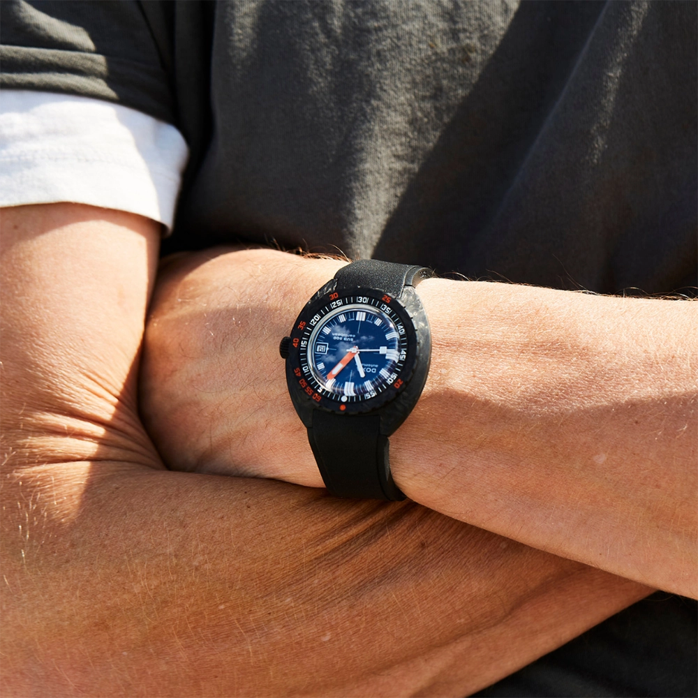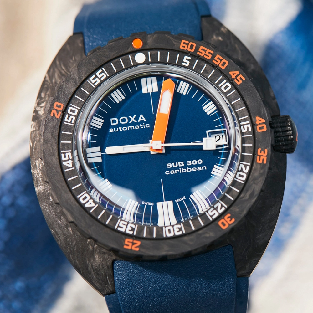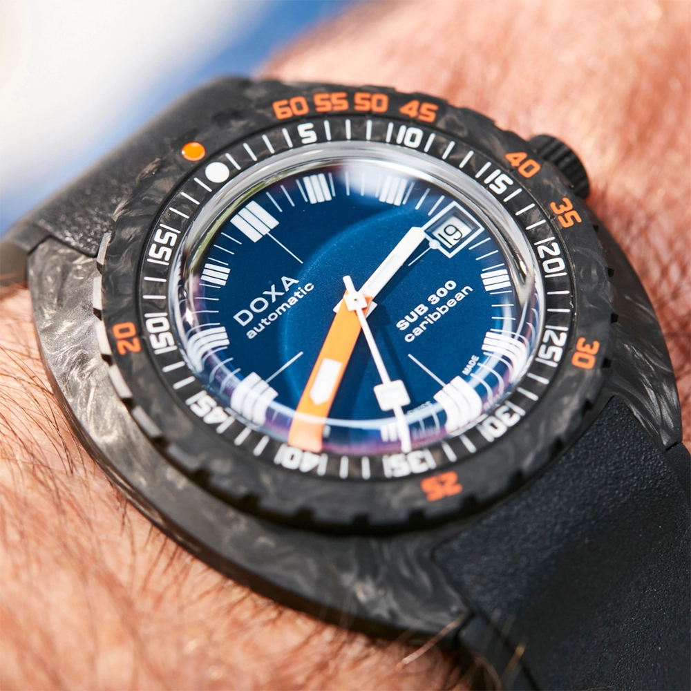 Каучуковий ремінець з характерними символами DOXA з обох боків оснащений застібкою, що розкладається, з чорним PVD-покриттям, прикрашеною символом риби DOXA. Він також має регульований подовжувач для гідрокостюма.