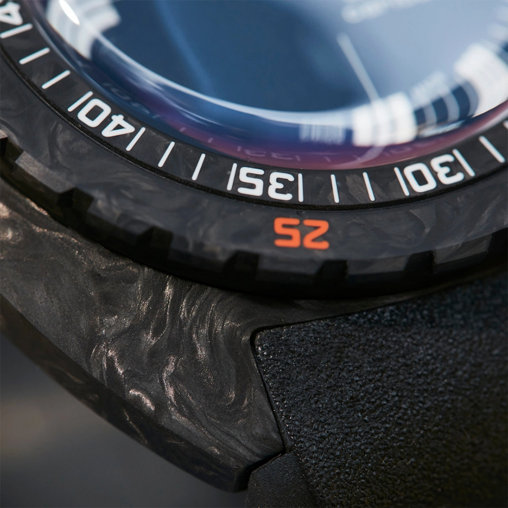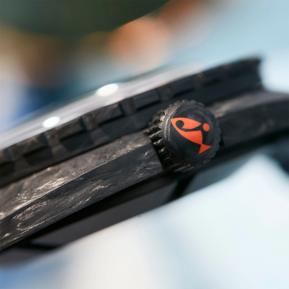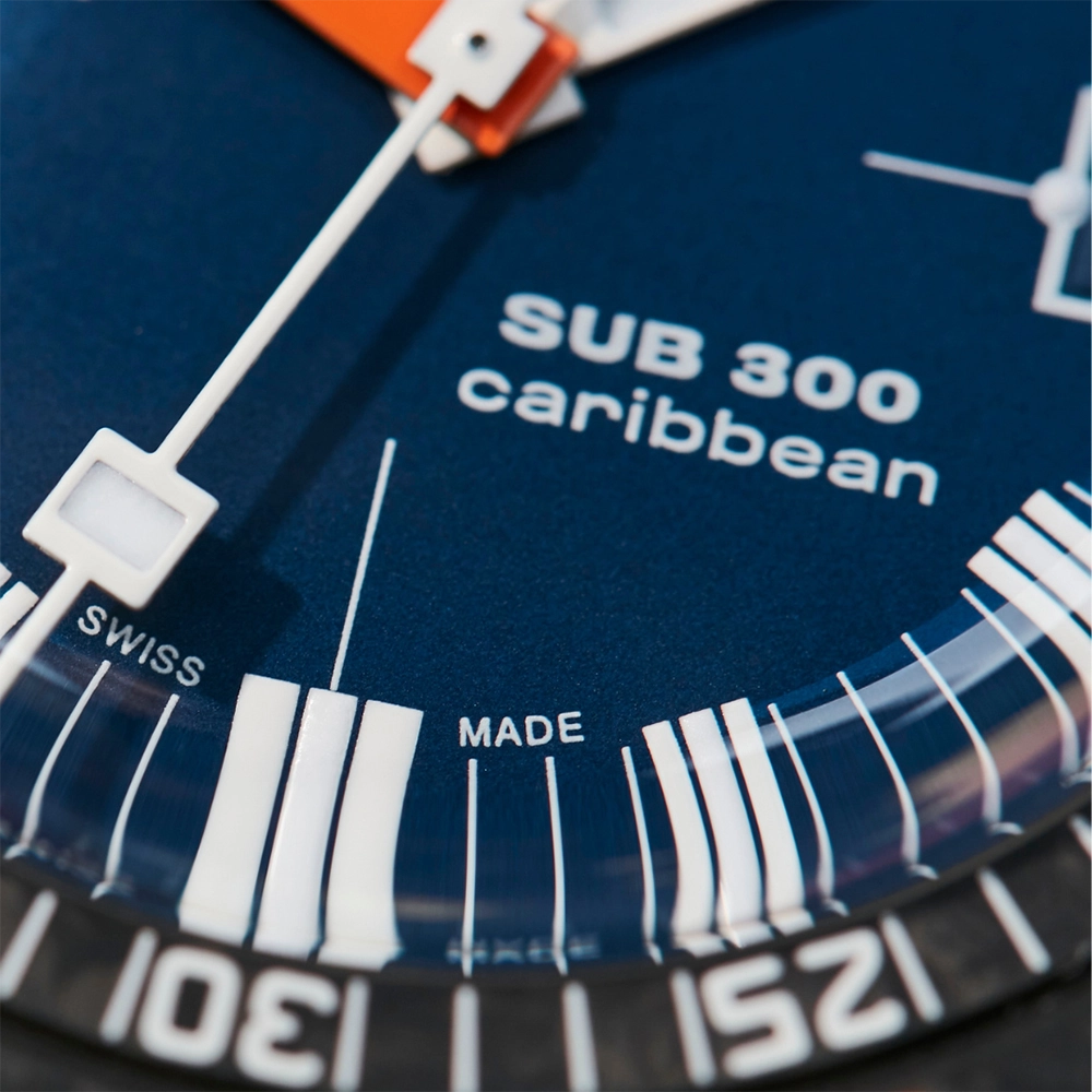 На знак поваги до своєї спадщини карбонова модель SUB 300 оснащена стійким до подряпин сапфіровим склом з покриттям антивідблиску. Скло має ту ж куполоподібну форму, що й плексиглас оригіналу 1967 року. Мітки на циферблаті та безелі та стрілки мають люмінесцентне покриття Super-LumiNova®, що забезпечує чудову читаність в умовах поганої видимості.