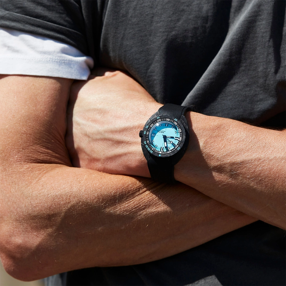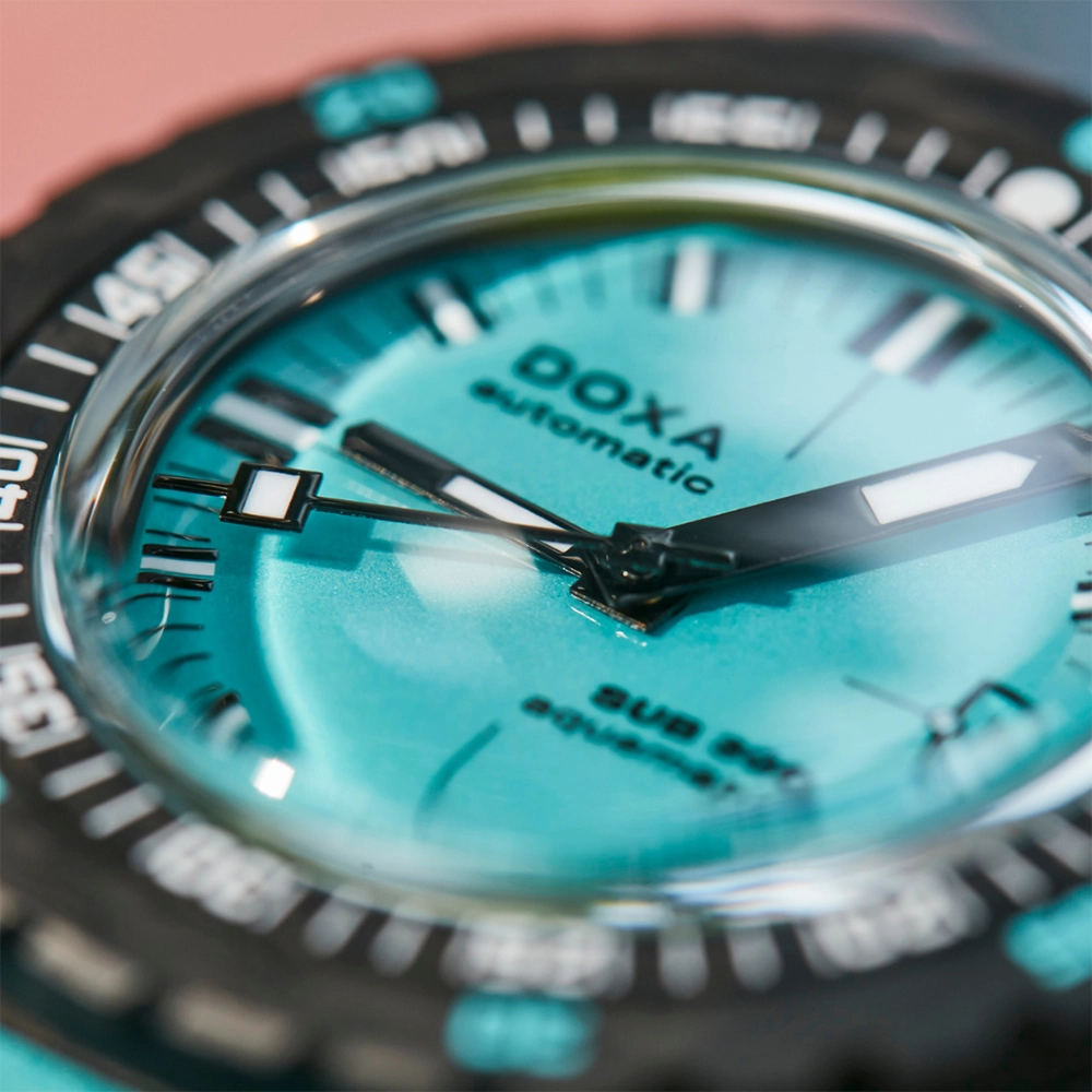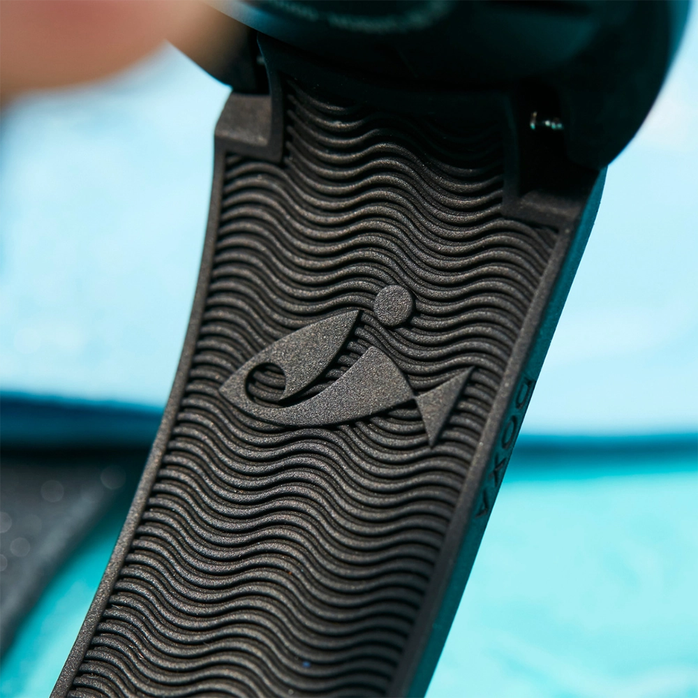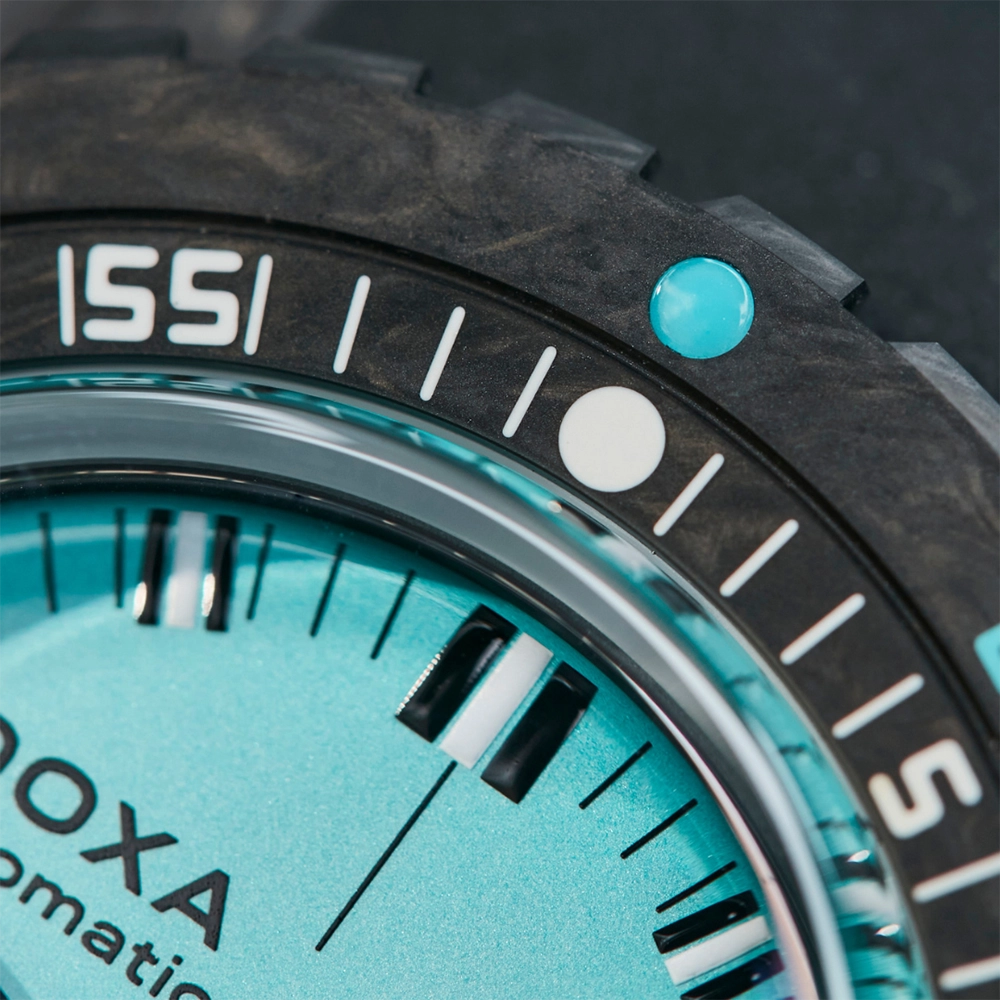 Каучуковий ремінець з характерними символами DOXA з обох боків оснащений застібкою, що розкладається, з чорним PVD-покриттям, прикрашеною символом риби DOXA. Він також має регульований подовжувач для гідрокостюма.