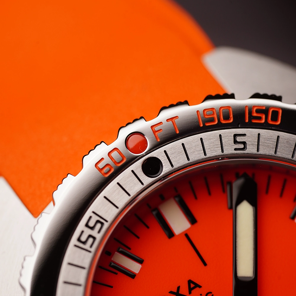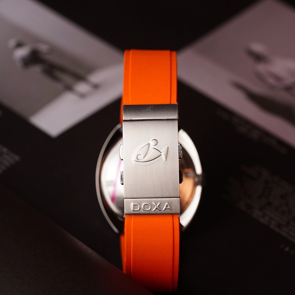 Годинник має спортивний каучуковий ремінець з характерними знаками DOXA з обох боків та подовжувачем для гідрокостюма.