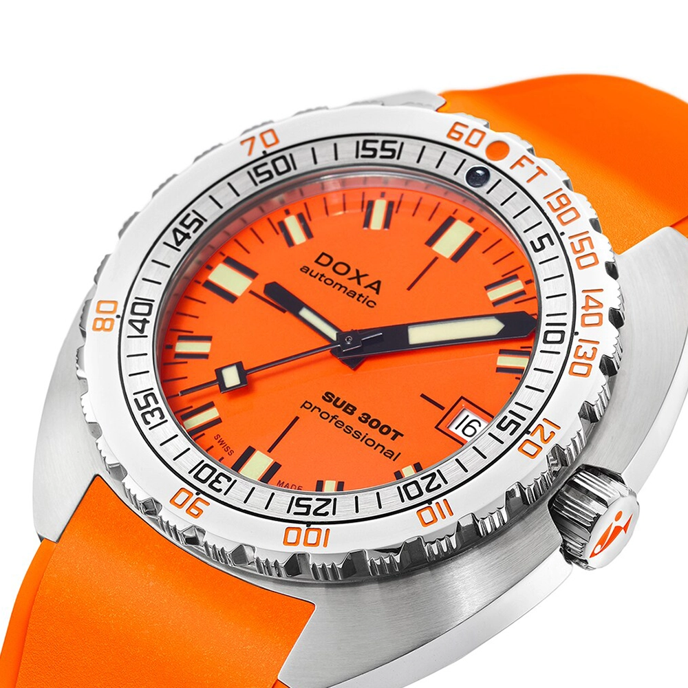 SUB 300T оснащений знаменитим однонаправленим безелем, що обертається, запатентованим DOXA, з подвійною індикацією часу занурення в хвилинах і глибини в метрах для розрахунку часу занурення з безупинною декомпресією. Водонепроникність годинника з заводною головкою, що загвинчується становить 1200 метрів. У годиннику є гелієвий клапан.