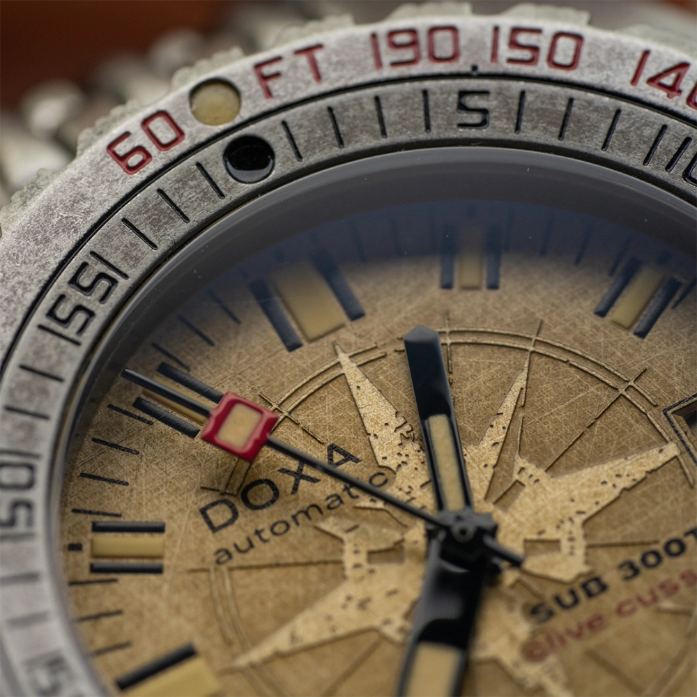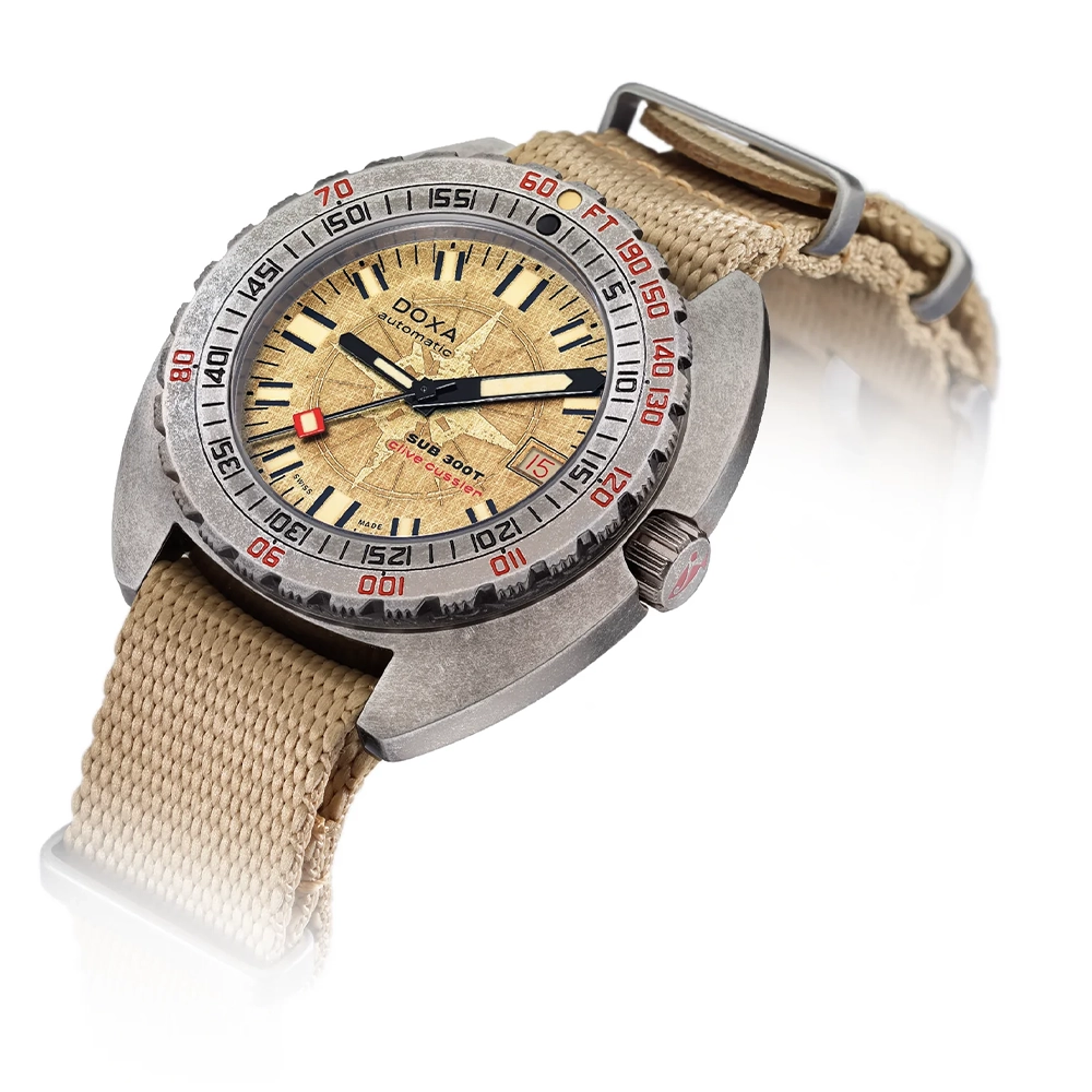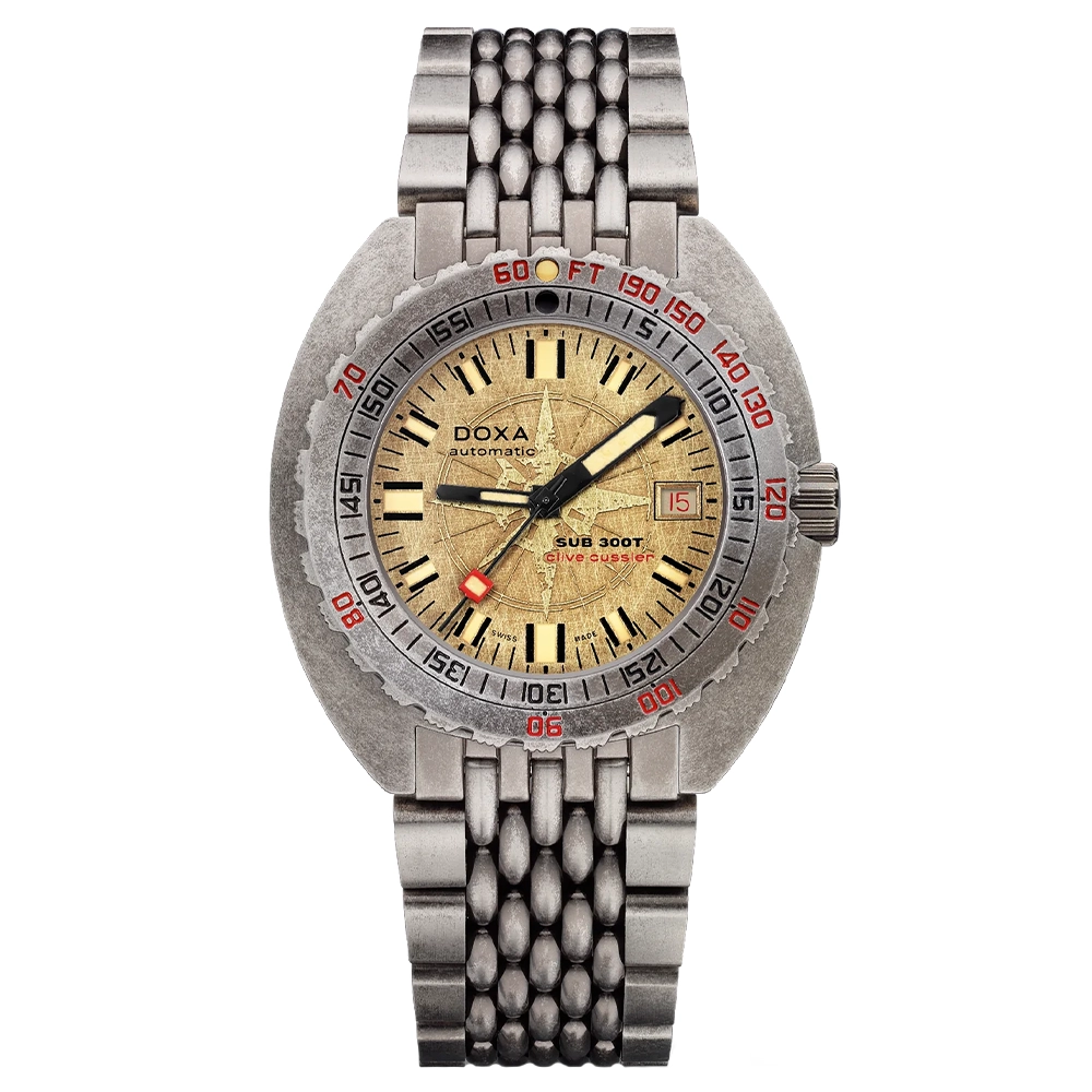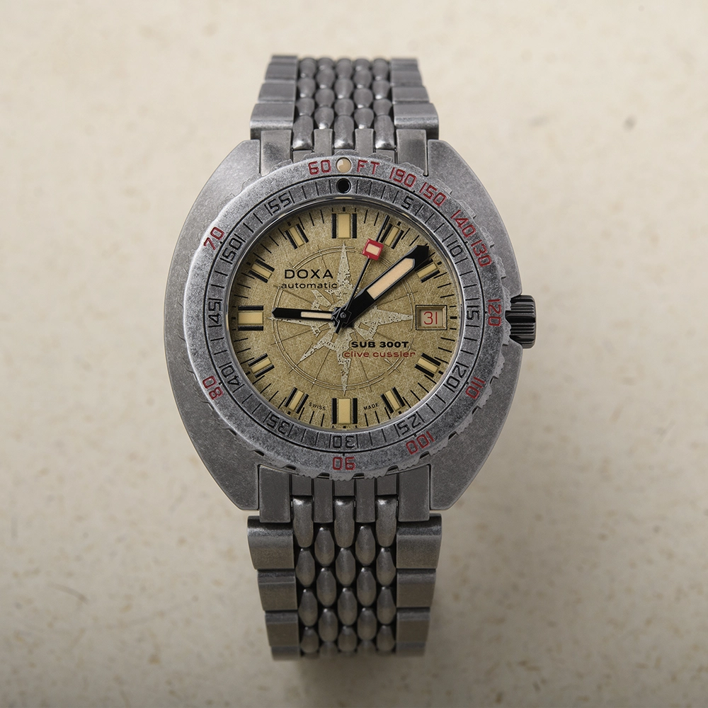 SUB 300T Clive Cussler залишається вірним основним характеристикам колекції, проте має унікальні особливості. Завдяки оригінальному циферблату ручної роботи, що нагадує старовинний компас, і використанню зістареної сталі на годиннику, браслеті, застібці та пряжці-шпильці, годинник створений для того, щоб бути на зап’ястях шукачів пригод в одному з романів письменника Клайва Касслера.