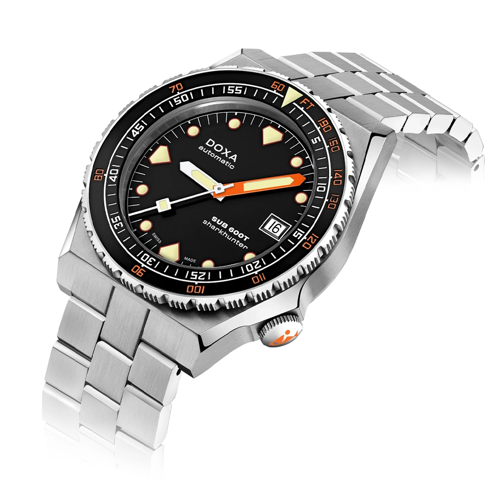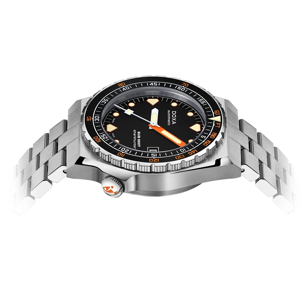 SUB 600T оснащений знаменитим однонаправленим безелем, що обертається, запатентованим DOXA, з керамічною вставкою та подвійною індикацією часу занурення у хвилинах і глибини в метрах для розрахунку часу занурення з безперервною декомпресією. Водонепроникність годинника із заводною головкою, що загвинчується, становить 600 метрів.