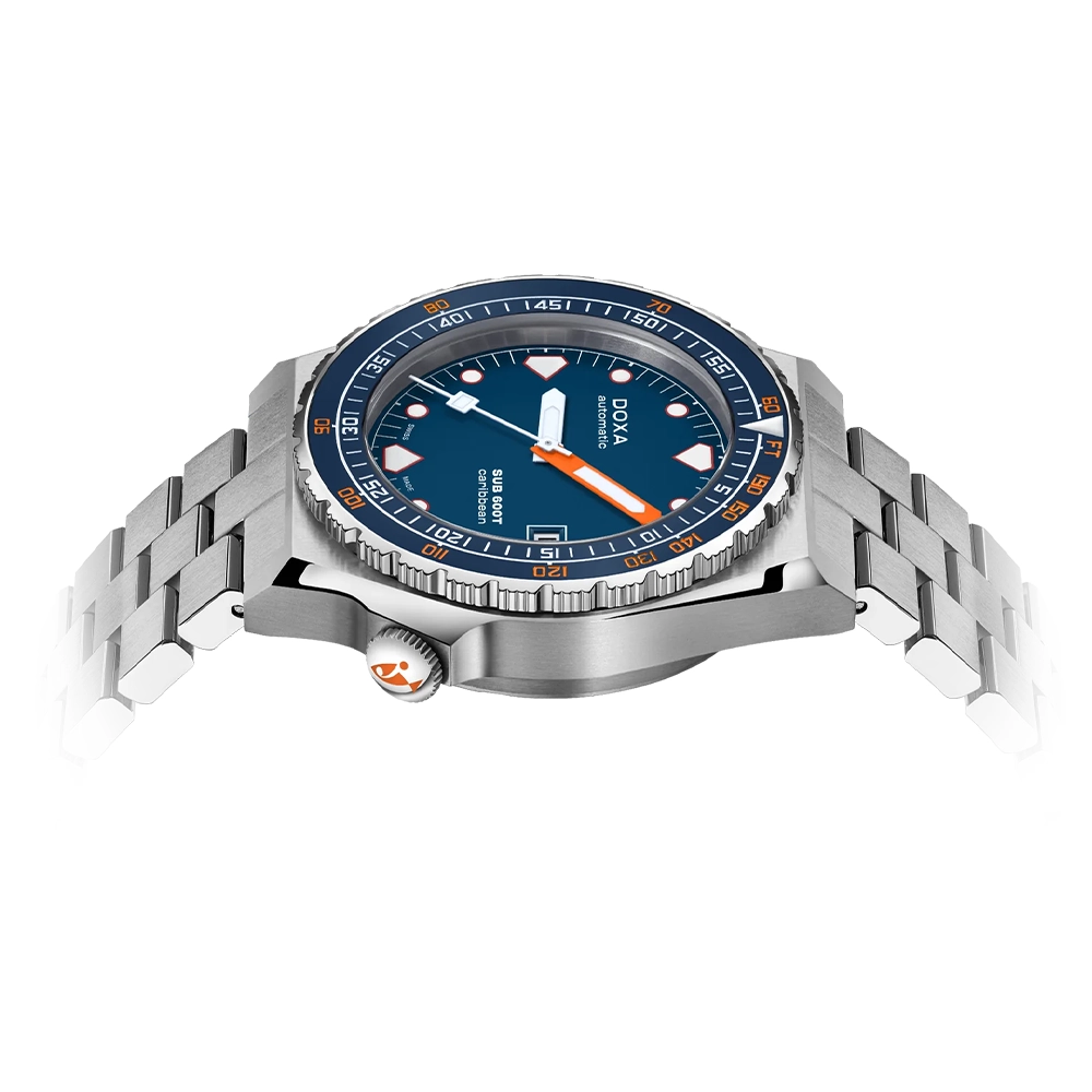SUB 600T оснащений знаменитим однонаправленим безелем, що обертається, запатентованим DOXA, з керамічною вставкою та подвійною індикацією часу занурення у хвилинах і глибини в метрах для розрахунку часу занурення з безперервною декомпресією. Водонепроникність годинника із заводною головкою, що загвинчується, становить 600 метрів.