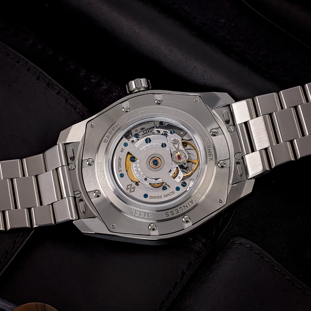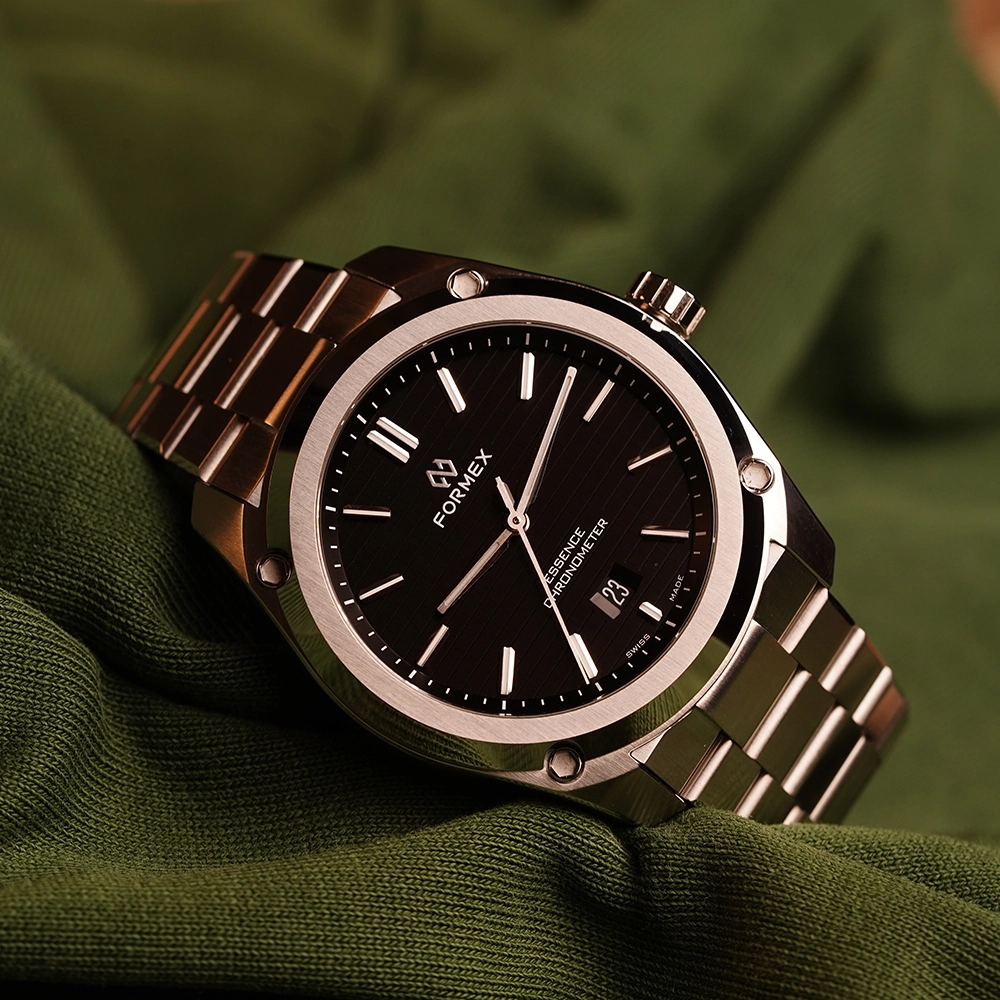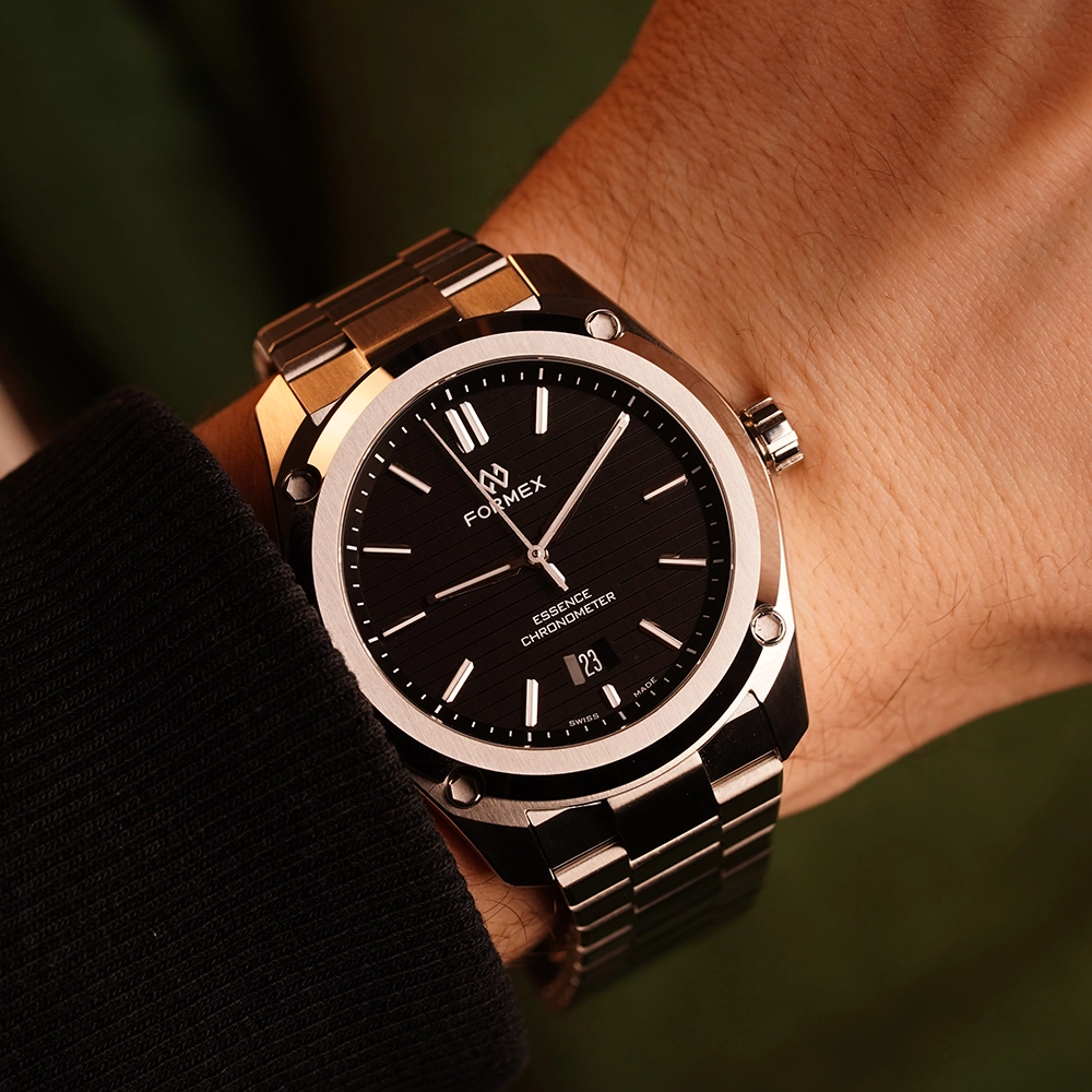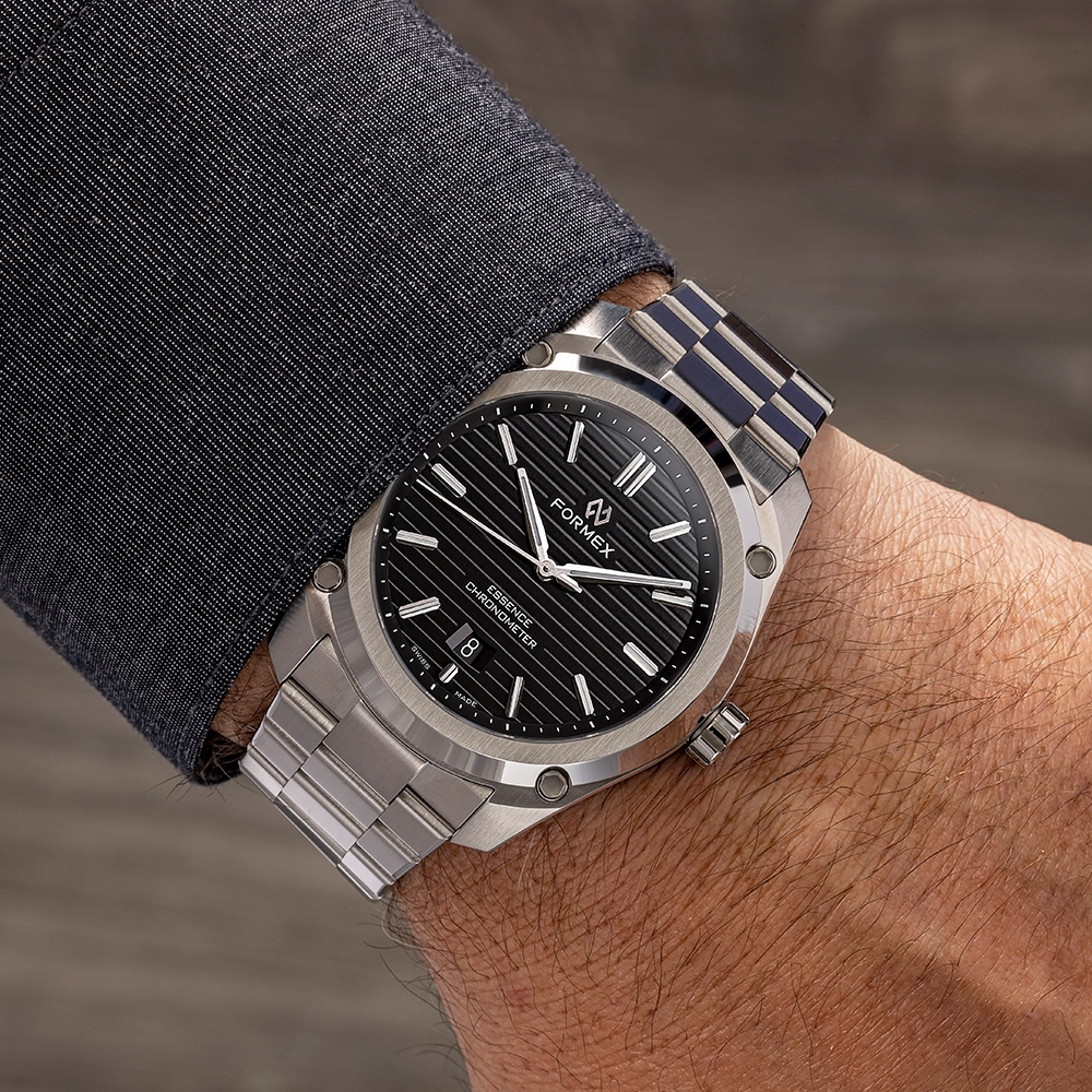 FORMEX ESSENCE AUTOMATIC COSC "BLACK" 43MM 0330.1.6321.100 - це годинник з колекції ESSENCE, оснащений сертифікованим COSC механічним калібром Sellita. Особливість моделі - її циферблат.