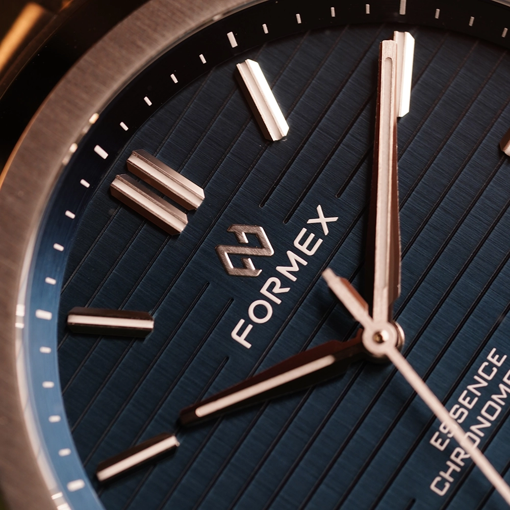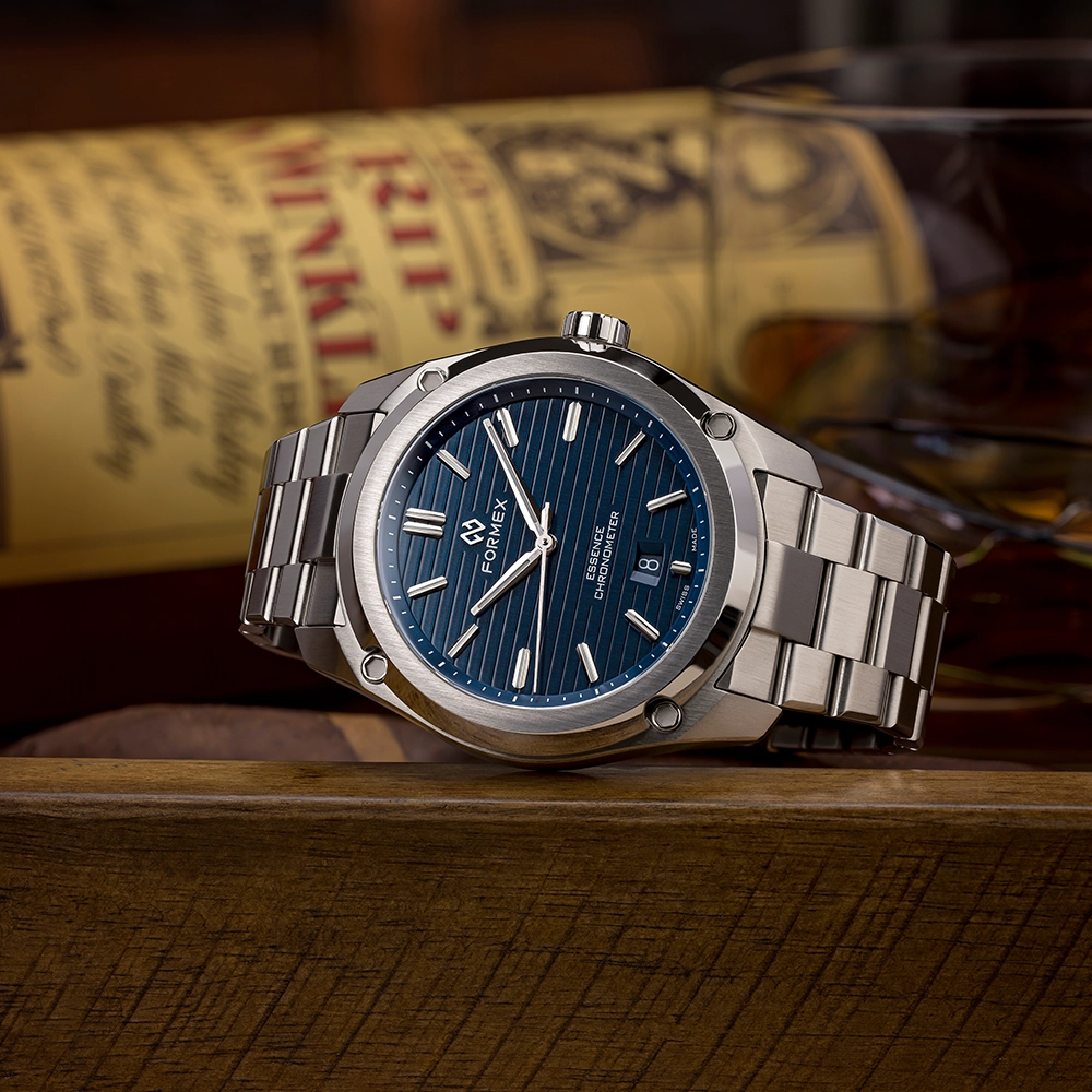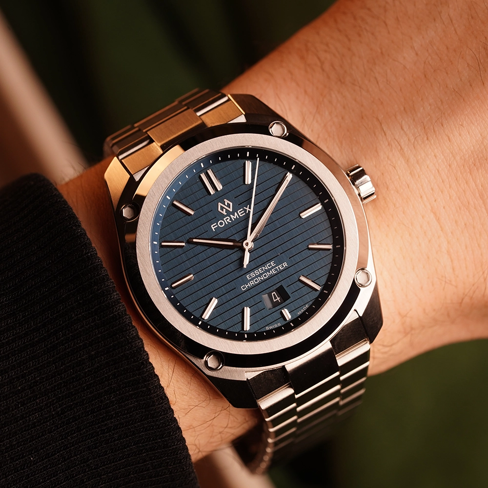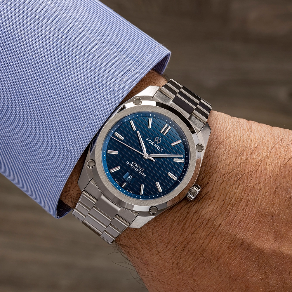 FORMEX ESSENCE AUTOMATIC COSC "BLUE" 43MM 0330.1.6331.100 - це годинник з колекції ESSENCE, оснащений сертифікованим COSC механічним калібром Sellita. Особливість моделі - її циферблат.
