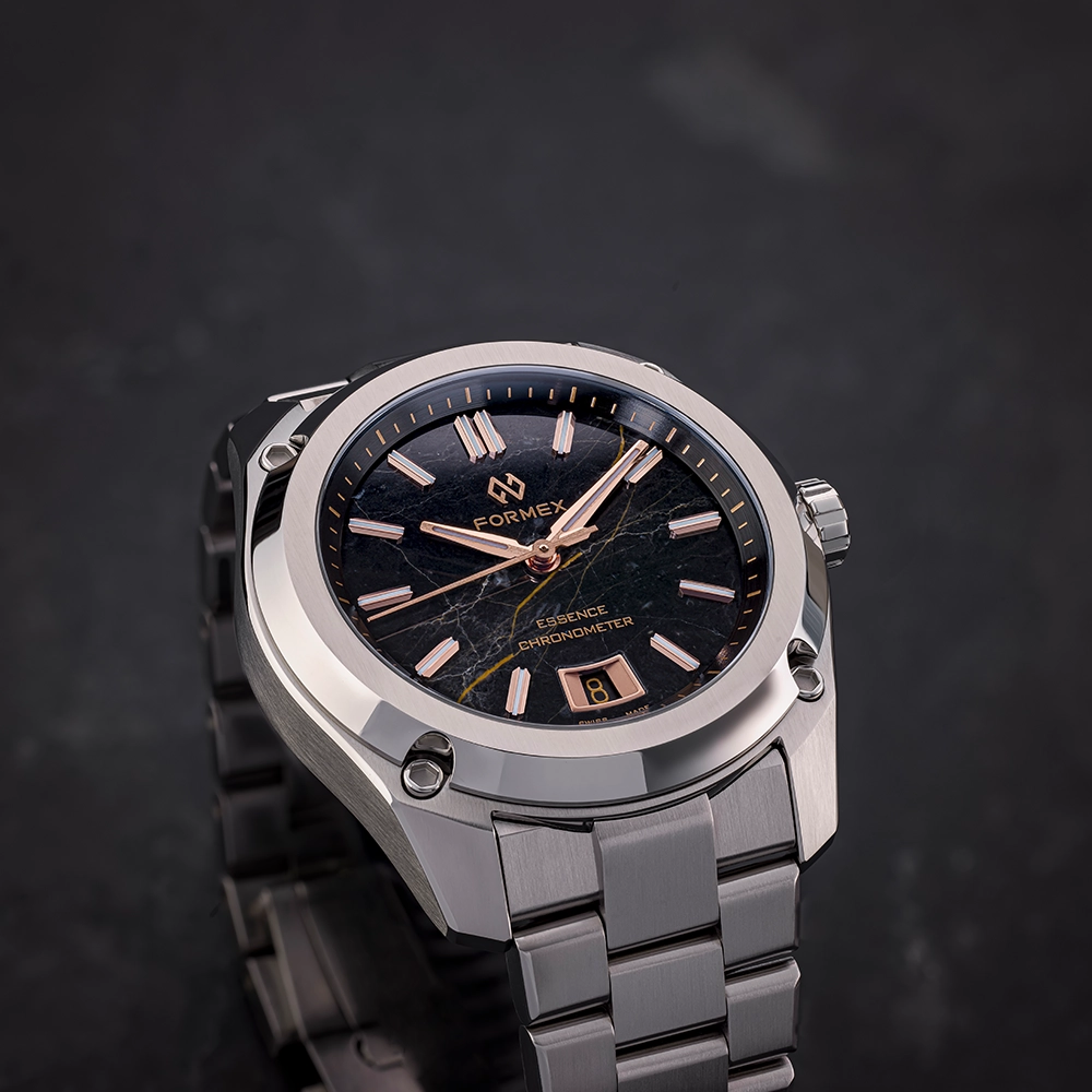 FORMEX ESSENCE AUTOMATIC COSC "EISENKIESEL" 39MM SPECIAL EDITION 0333.1.6625.100 - це годинник з колекції ESSENCE, оснащений сертифікованим COSC механічним калібром Sellita. Особливість моделі - її циферблат.