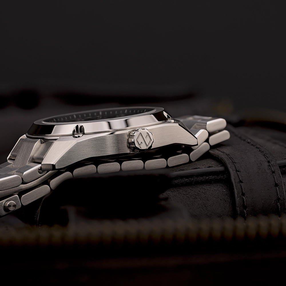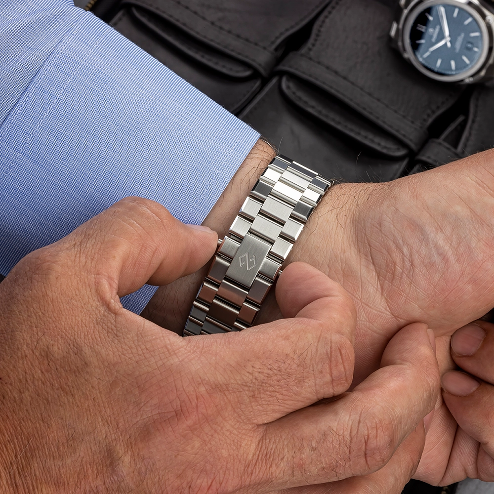 Сталевий браслет з гвинтами має застібку із запатентованою системою регулювання, а також повністю оновлену та запатентовану систему швидкого з’єднання, яка дозволяє міняти браслет на ремінець без використання будь-яких інструментів.