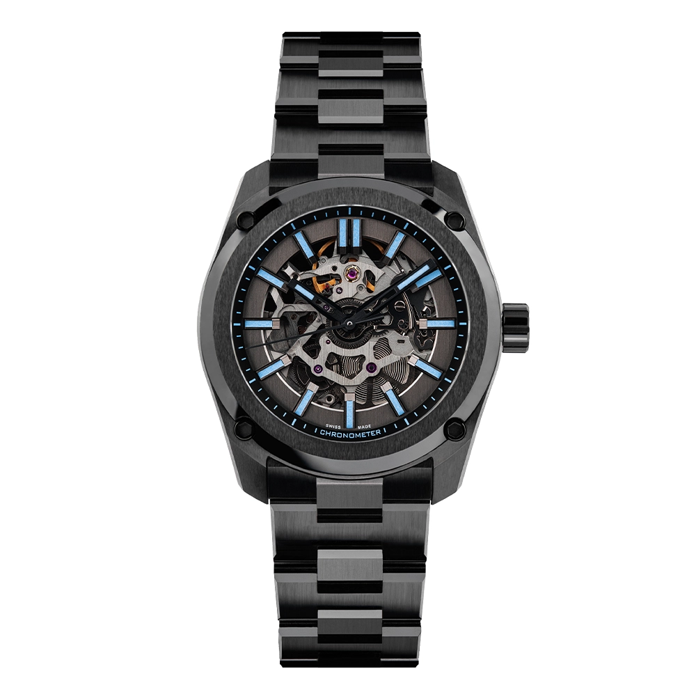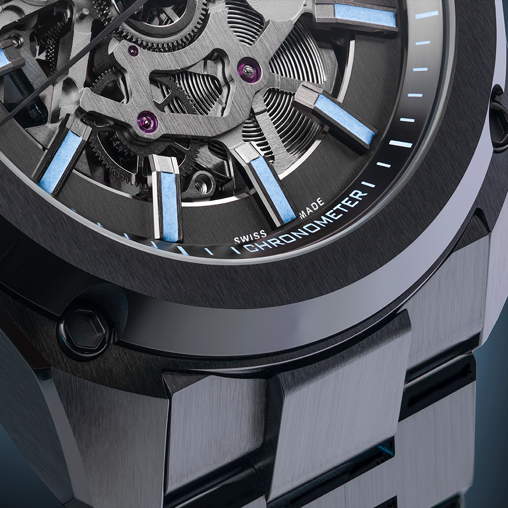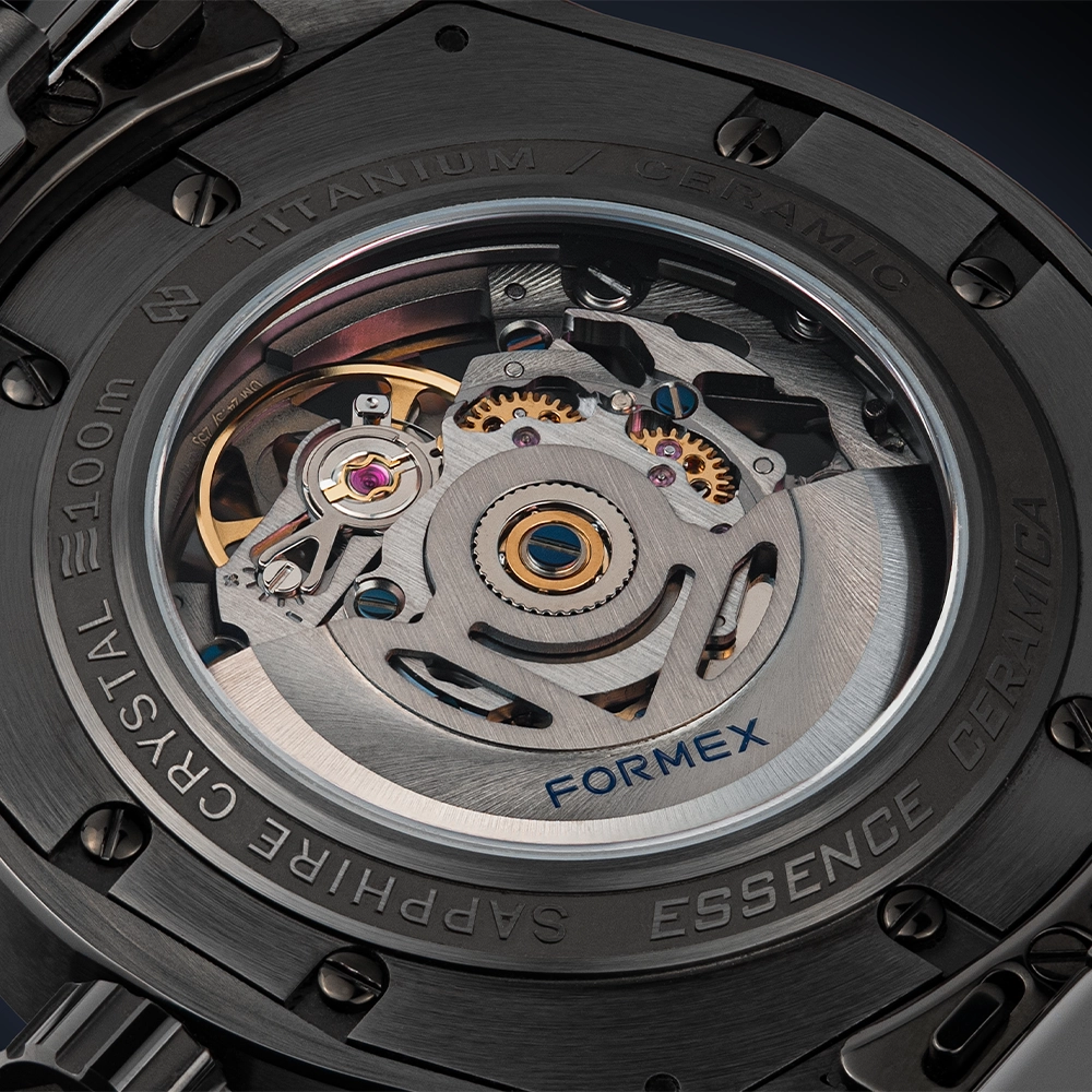 Essence Ceramica Skeleton COSC представлений до 25-річчя Formex - модель переосмислює виготовлення керамічних годинників, пропонуючи виняткову стійкість до подряпин, довговічність і бездоганний вигляд протягом усього життя. Сертифікований COSC скелетонований механізм забезпечує вищу хронометричну точність, яка демонструється через багатошаровий відкритий циферблат, виготовлений швейцарським спеціалістом з циферблатів Cadranor.