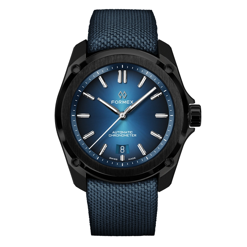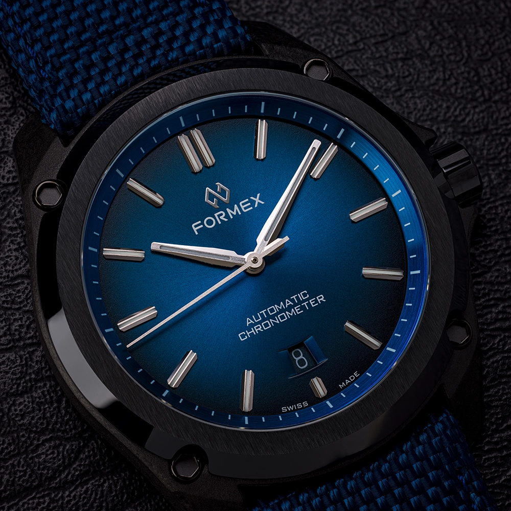 FORMEX ESSENCE LEGGERA AUTOMATIC COSC "ELECTRIC BLUE" 41MM 0331.4.6339.844 - це годинник з колекції ESSENCE LEGGERA, оснащений сертифікованим COSC механічним калібром Sellita. Особливість моделі - матеріал корпусу.