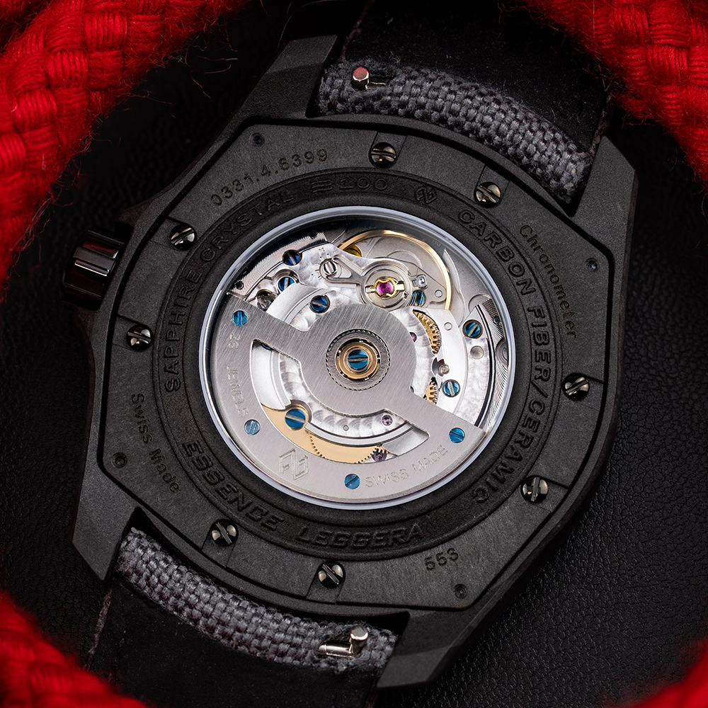 Корпус з карбону і повністю розроблений власними силами. Глибокий чорний колір корпусу Formex Leggera досягається завдяки вибору матеріалу, а не покриття поверхні, як DLC або PVD. Це гарантує, що ваш годинник завжди залишатиметься чорним. Будучи найбільш відкритими компонентами корпусу годинника, безель і заводна головка виготовлені з високотехнологічної кераміки, яка перевершує твердість будь-якого традиційного металу, який використовується в годинникарстві.