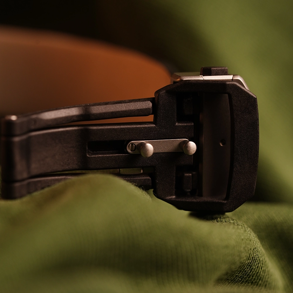 Ремінець зроблено з італійської телячої шкіри з вигнутими пружинними стрижнями, функцією Quick Release і складною застібкою з карбону та сталі з запатентованою системою мікрорегулювання.