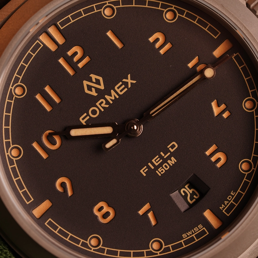 Циферблат має дещо втоплені цифри та годинникові мітки, вкриті люмінесцентним покриттям Super-LumiNova в кольорі Old Radium.