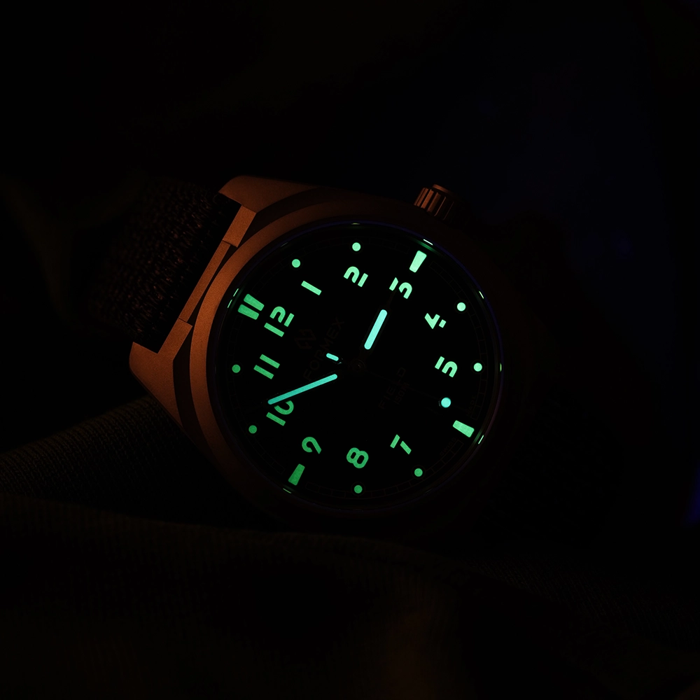 Циферблат має дещо втоплені цифри та годинникові мітки, вкриті люмінесцентним покриттям Super-LumiNova в кольорі Old Radium.
