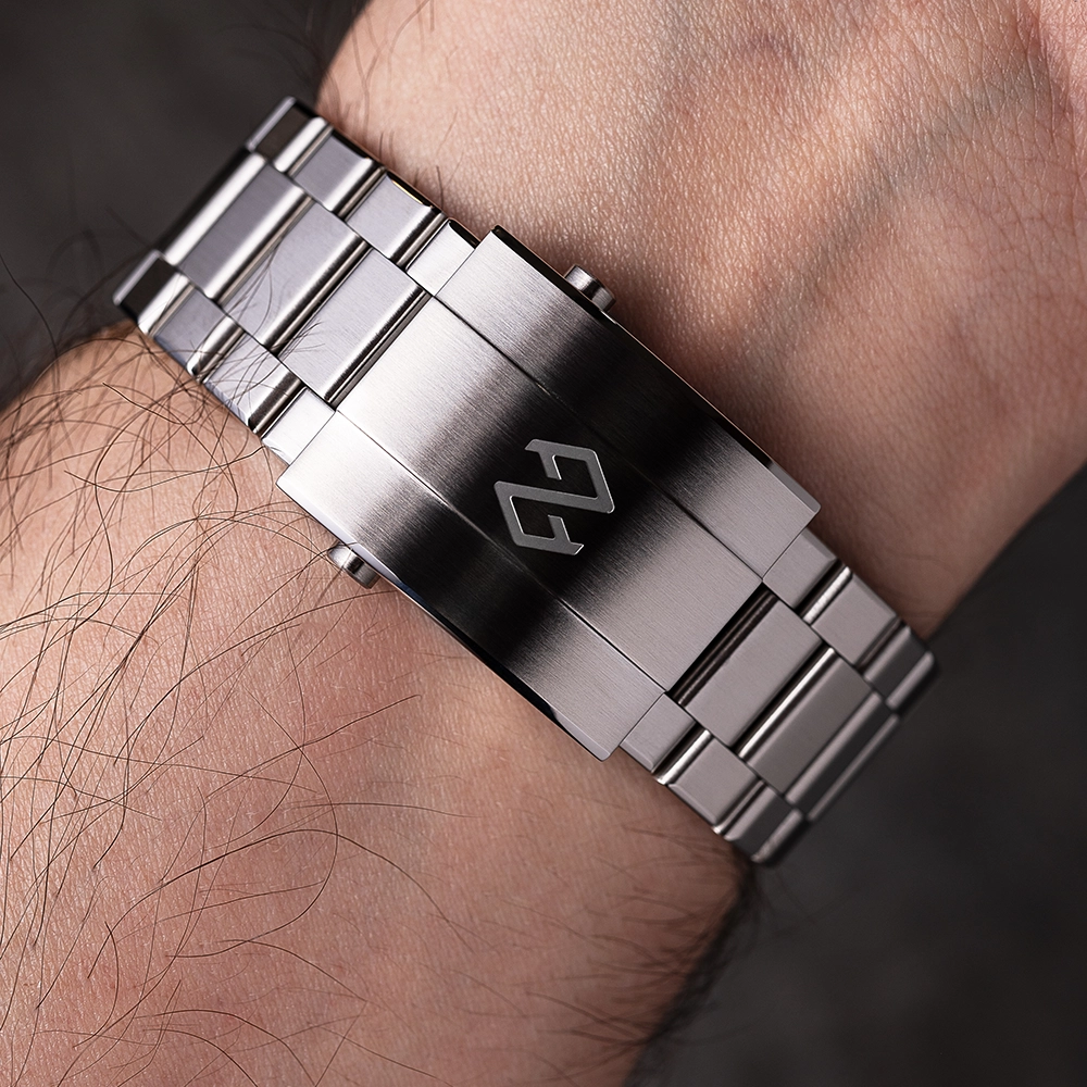 Сталевий браслет з гвинтами має застібку із запатентованою системою регулювання, а також повністю оновлену та запатентовану систему швидкого з’єднання, яка дозволяє міняти браслет на ремінець без використання будь-яких інструментів.