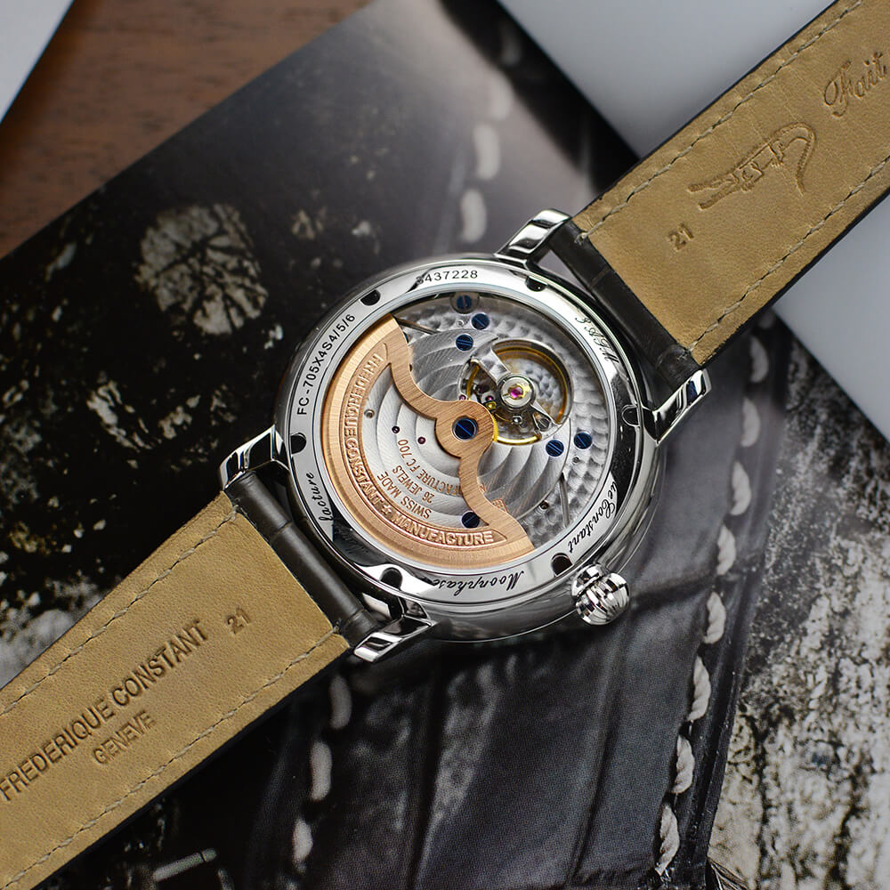 Є індикатор дати, задня прозора кришка, місячний календар.
