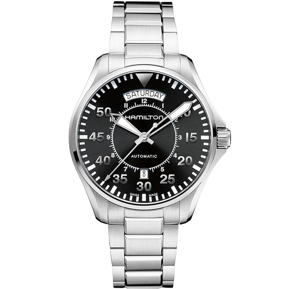 Чоловічий годинник Khaki Hamilton Aviation Pilot Day Date Auto H64615135 - характерний представник tool watch, виконаний в авіаційній тематиці в лінійці Khaki Aviation. Ця модель — данина поваги військовій авіації та годинникам Type-B з циферблатом та характеристиками, які проводилися спеціально для штурманів у 1940-х та 1950-х роках. Циферблат виконаний у точній відповідності з німецьким годинником Beobachtungs-Uhren (годинник для спостереження) - з двозначними арабськими цифрами, вінтажними люмінесцентними маркерами та стрілками у формі меча.