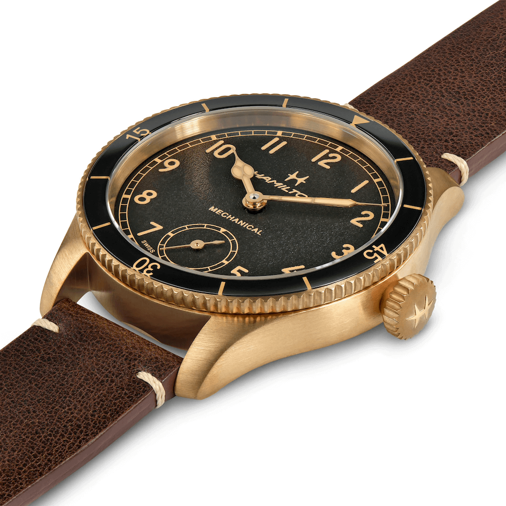 Чоловічий годинник Hamilton Khaki Aviation Pilot Pioneer Bronze H76709530 натхненний годинником Hamilton Model 23, кишеньковим годинником, який використовували солдати США під час Другої світової війни.