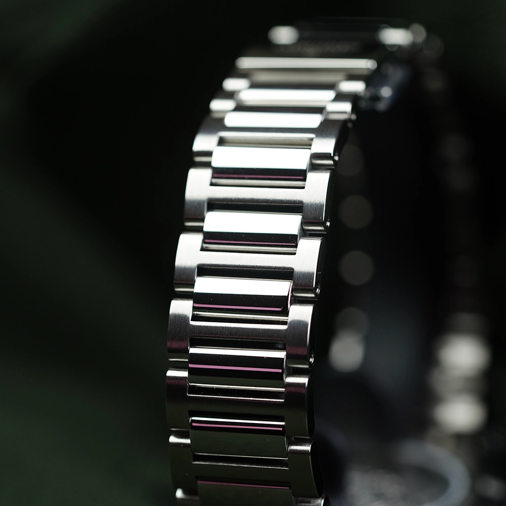 Браслет зроблений з нержавіючої сталі. Розкладна потрійна застібка з системою блокування та кнопкою.