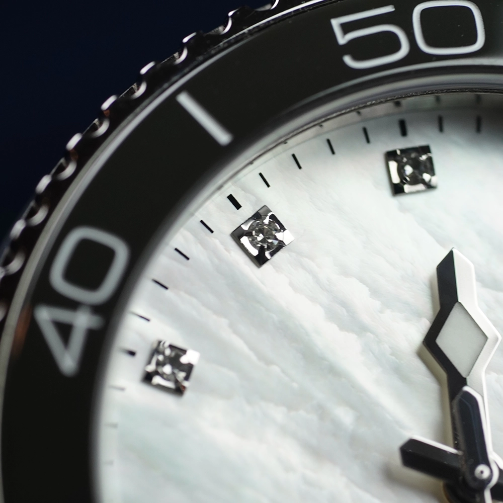 Корпус і браслет годинника виконані з гіпоалергенної сталі 316L. Застібка, що розкладається, з дайверським розширювачем. Ширина браслета 16 мм. Циферблат із натурального перламутру інкрустований 11 діамантами Top Wesselton VS-SI вагою 0,044 карати.