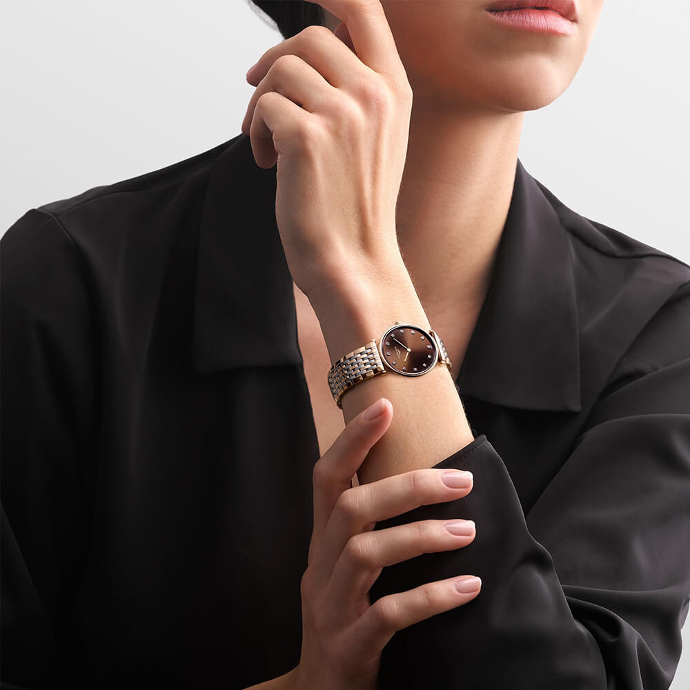 Корпус і браслет годинника виконаний із гіпоалергенної сталі 316L. Браслет із застібкою, що розкладається. Ширина браслета 16 мм. Циферблат інкрустований 12 діамантами Top Wesselton VS-SI загальною вагою 0,081 карата