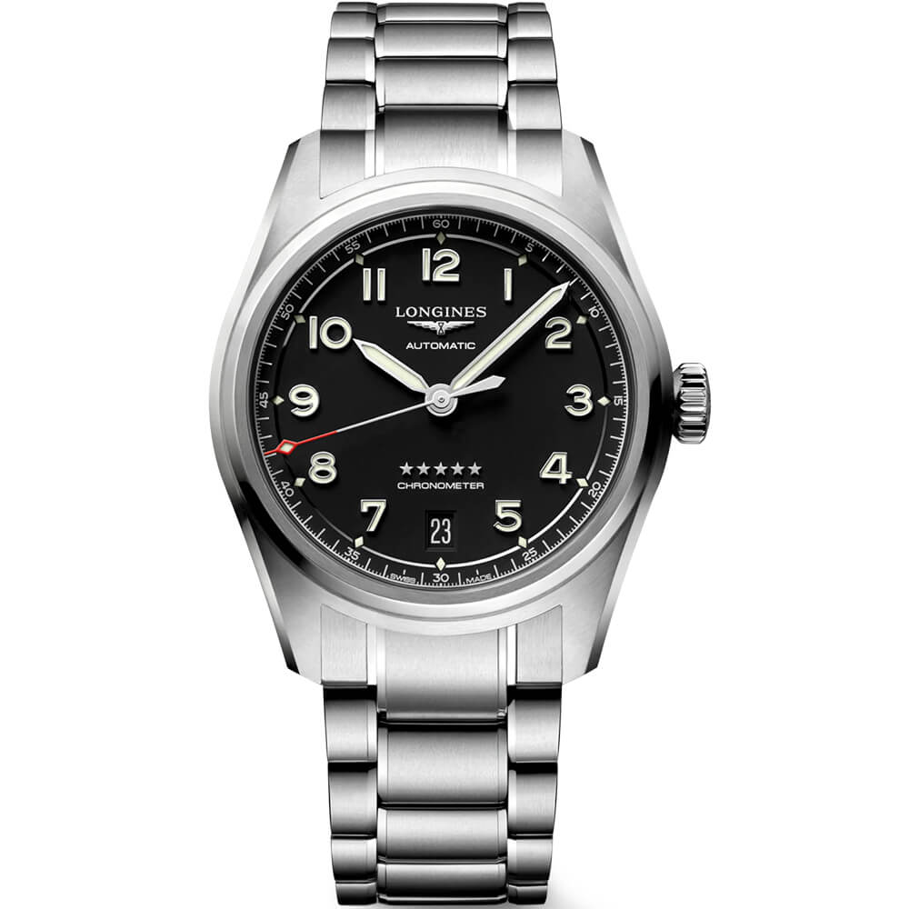 Годинник Longines Spirit має такі елементи як велика заводна головка, яскраво виражена піднята над склом частина корпусу, великий шрифт циферблата і стрілки у формі baton.