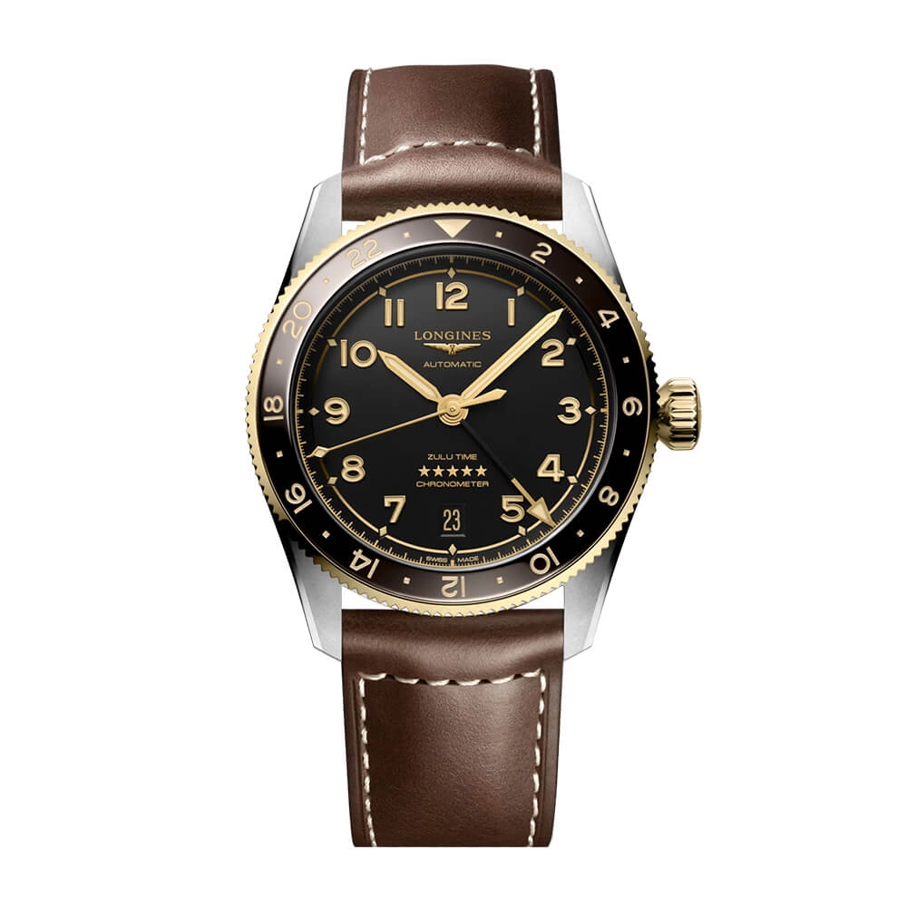 Годинник Longines Spirit має такі елементи як велика заводна головка, яскраво виражена піднята над склом частина корпусу, великий шрифт циферблата і стрілки у формі baton.
