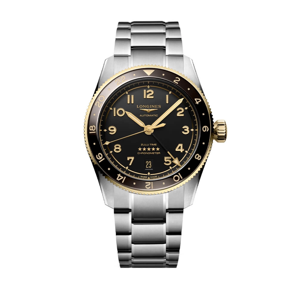 Годинник Longines Spirit має такі елементи як велика заводна головка, яскраво виражена піднята над склом частина корпусу, великий шрифт циферблата і стрілки у формі baton.