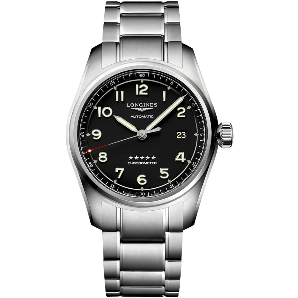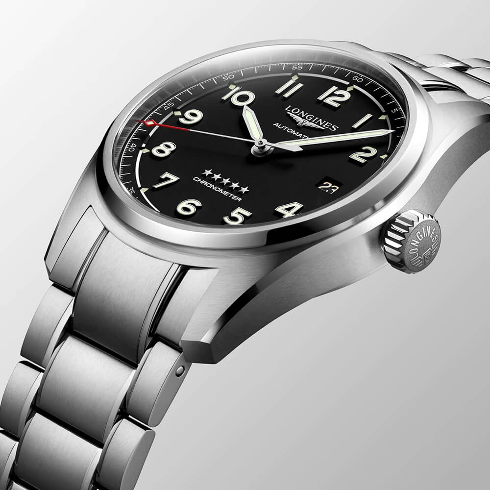 Годинник Longines Spirit має такі елементи як велика заводна головка, яскраво виражена піднята над склом частина корпусу, великий шрифт циферблата і стрілки у формі baton.