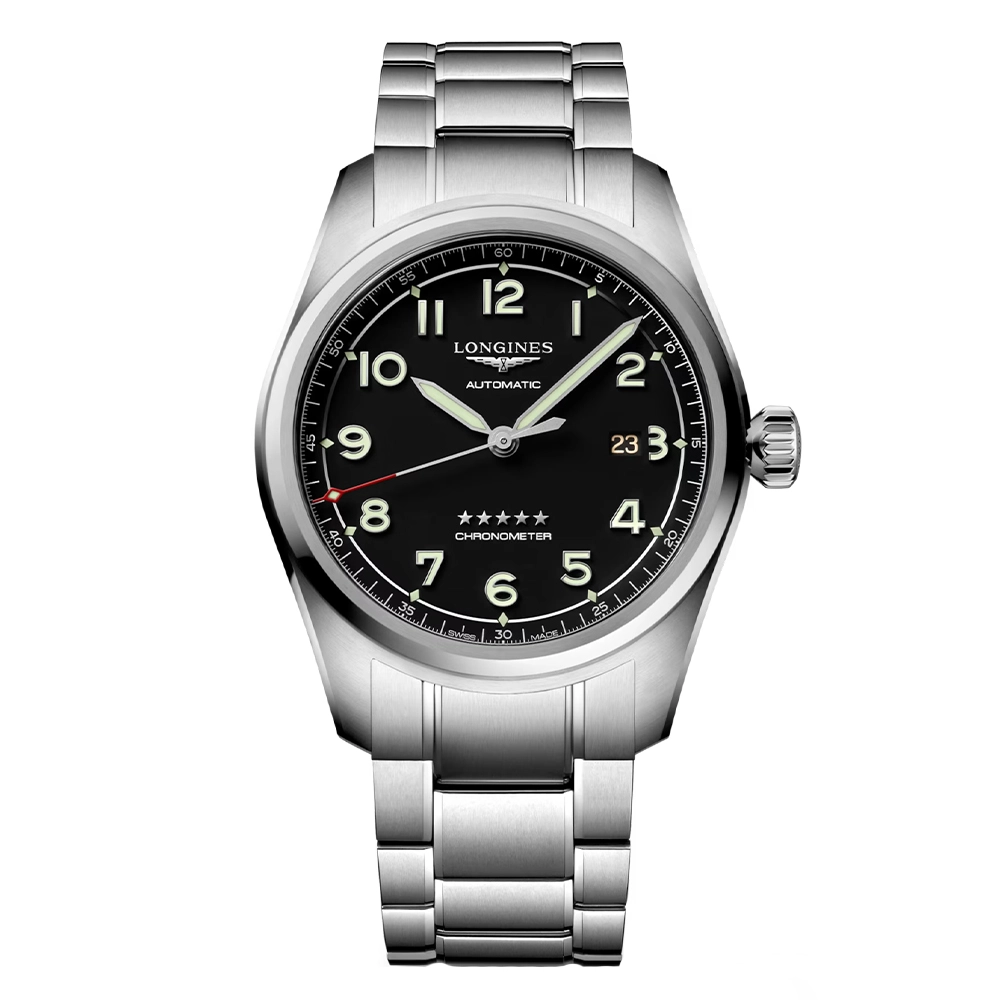 Годинник Longines Spirit має такі елементи як велика заводна головка, яскраво виражена піднята над склом частина корпусу, великий шрифт циферблата і стрілки у формі baton.
