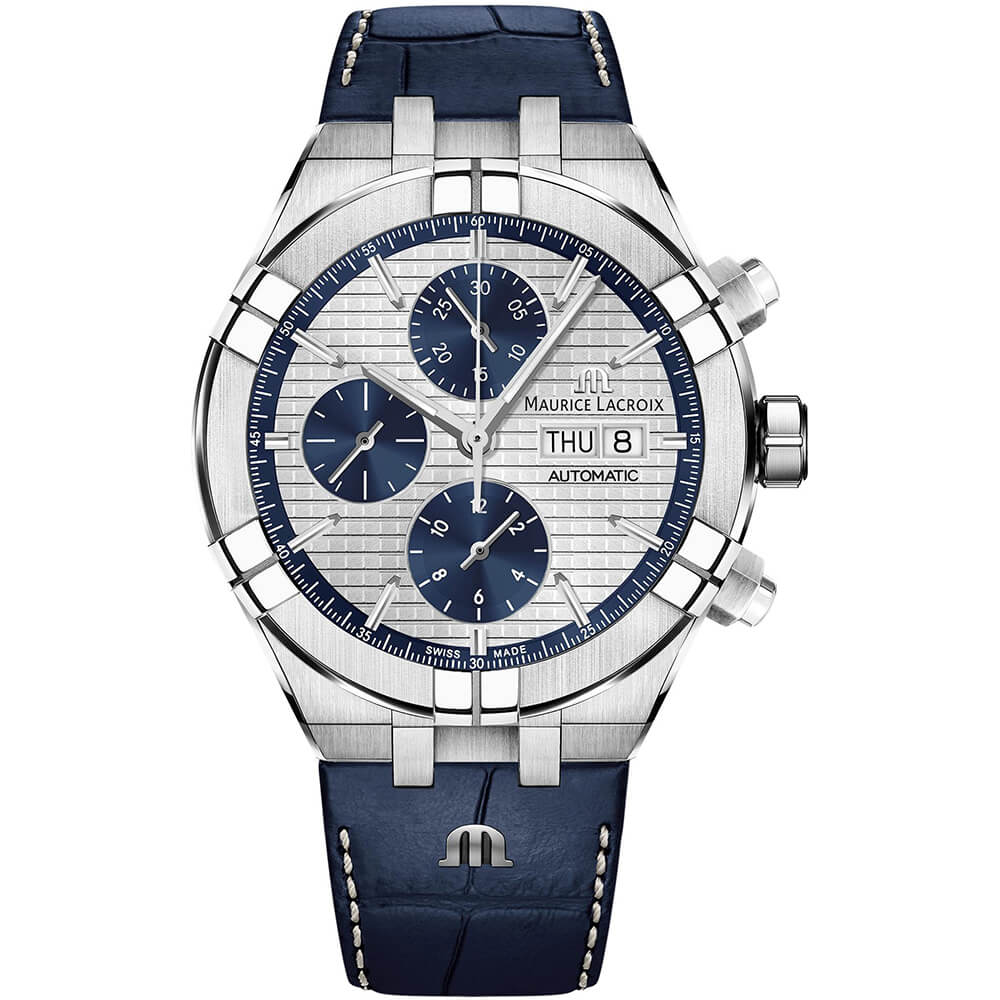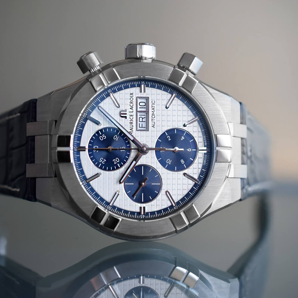 Циферблат сріблястого кольору прикрашений квадратним візерунком, лічильники хронографа мають поліровані контури та спіралеподібний візерунок. Індекси та мітки мають родієве покриття та люмінесцентне Super-LumiNova.