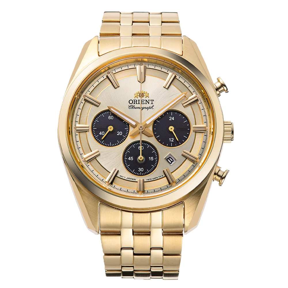 В годиннику встановлений кварцовий механізм який працює на сонячній батареї. Є хронограф та апертура дати.