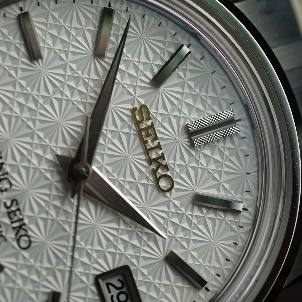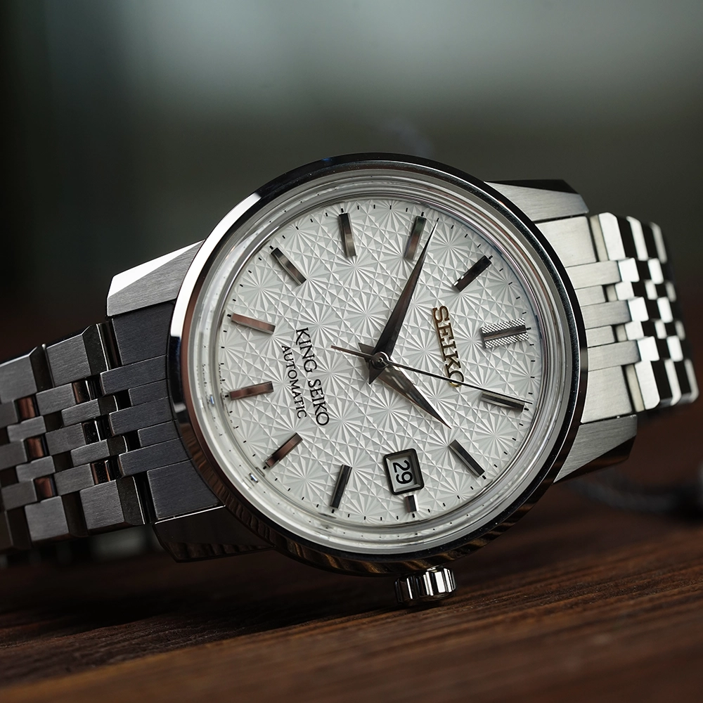 Годинник King Seiko Watchmaking 110th Anniversary Limited Edition SJE095J1 випущений до 110-річчя годинникової майстерності Seiko тиражем всього 600 штук на весь світ. Циферблат прикрашений геометричним візерунком, що відтворює хризантему, одну з національних квіток Японії. Рельєфний профіль зображений за допомогою тонких ліній, що перетинаються, так званих кіку цунагі-мон. Індекси вловлюють світло полірованими гранями, а подвійний індекс на 12 розкриває візерункову пірамідну текстуру. У комплекті також шкіряний ремінець бежевого кольору з застібкою, що розкладається.