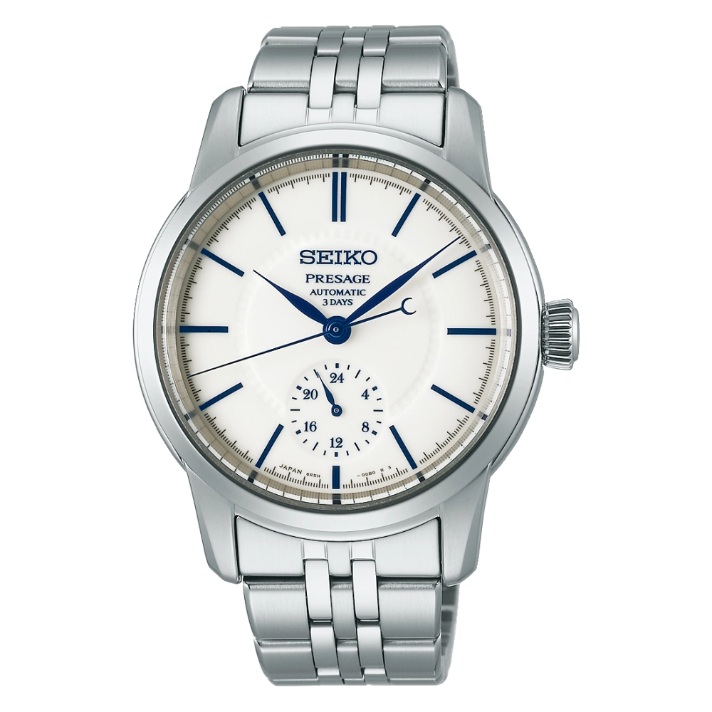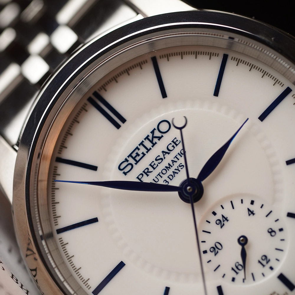 Сапфірове скло з антивідблисковим покриттям. Цей виріб вирізняється циферблатом «Hakuji», який підкреслює чистий білий колір порцеляни за допомогою прозорої глазурі. Прозора задня кришка.