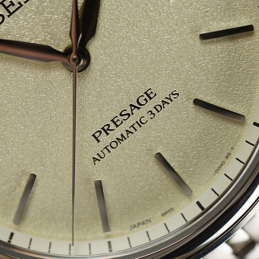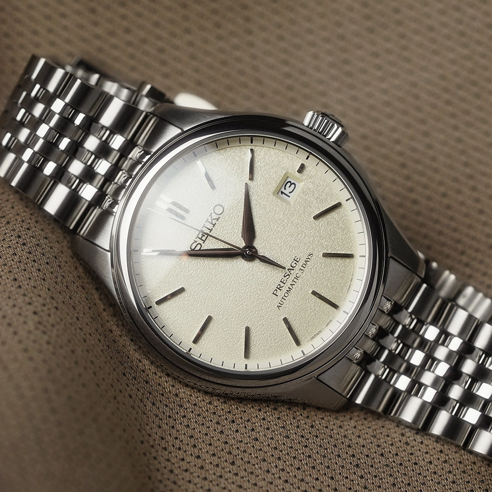 Годинник Seiko Presage SPB463J1 належить до нової серії Classic. Вигнутий циферблат демонструє складний фактурний візерунок, натхненний традиційними японськими шовковими тканинами. SPB463J1 представляє колір широ-іро, що нагадує невибілену натуральну тканину. Годинна та секундна стрілки витончено згинаються до маркерів, створюючи гармонійний візуальний баланс. В серії також цікавий багаторядний браслет у стилі 1970-х років з короткими ланками.