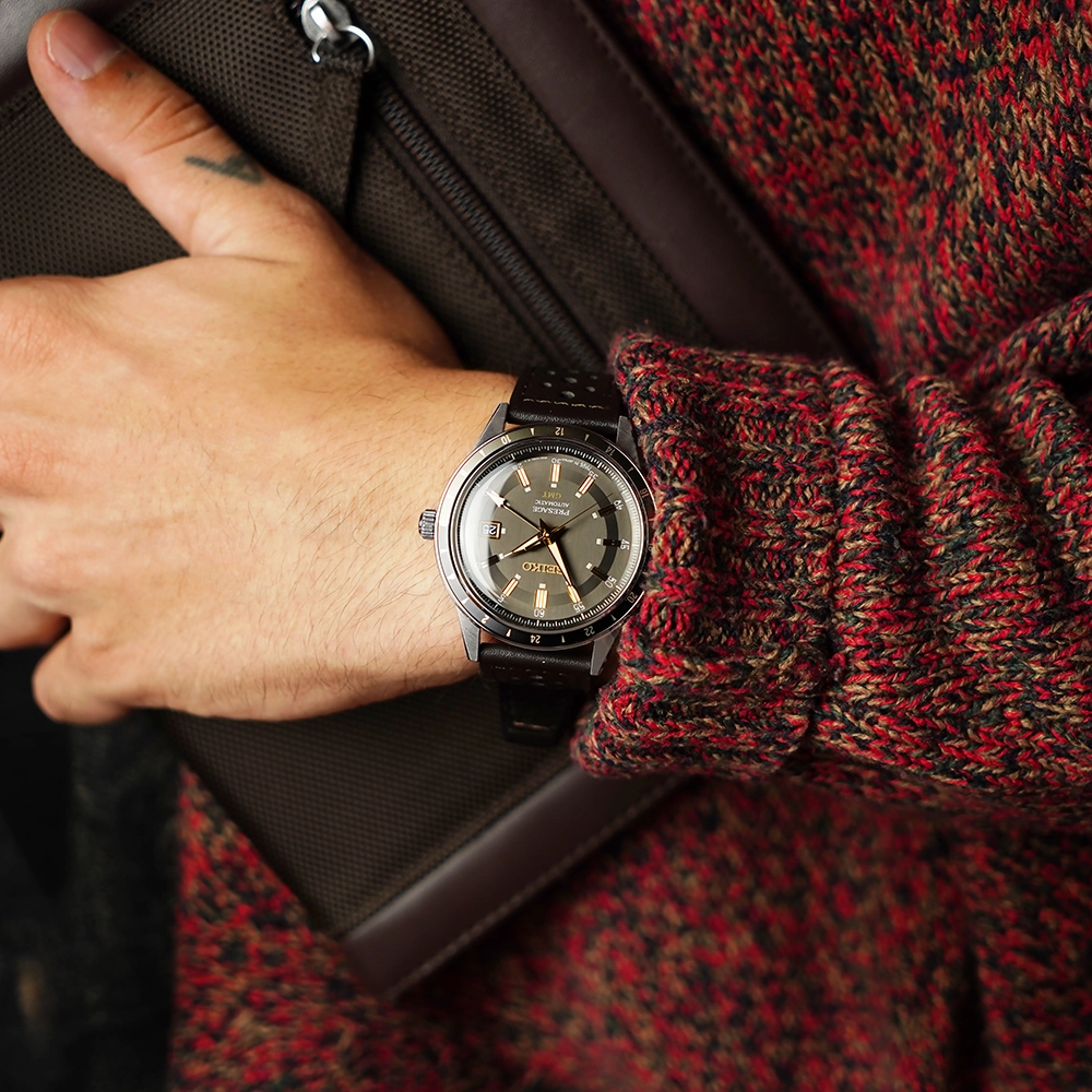 Матеріал корпусу – нержавіюча сталь 316L. На стрілках люмінесцентне покриття Seiko LumiBrite. Шкіряний ремінець з класичною застібкою пряжкою. Ширина ременя 20 мм. Циферблат захищає скло хардлекс. Є індикатор дати, функція GMT. Задня прозора кришка.