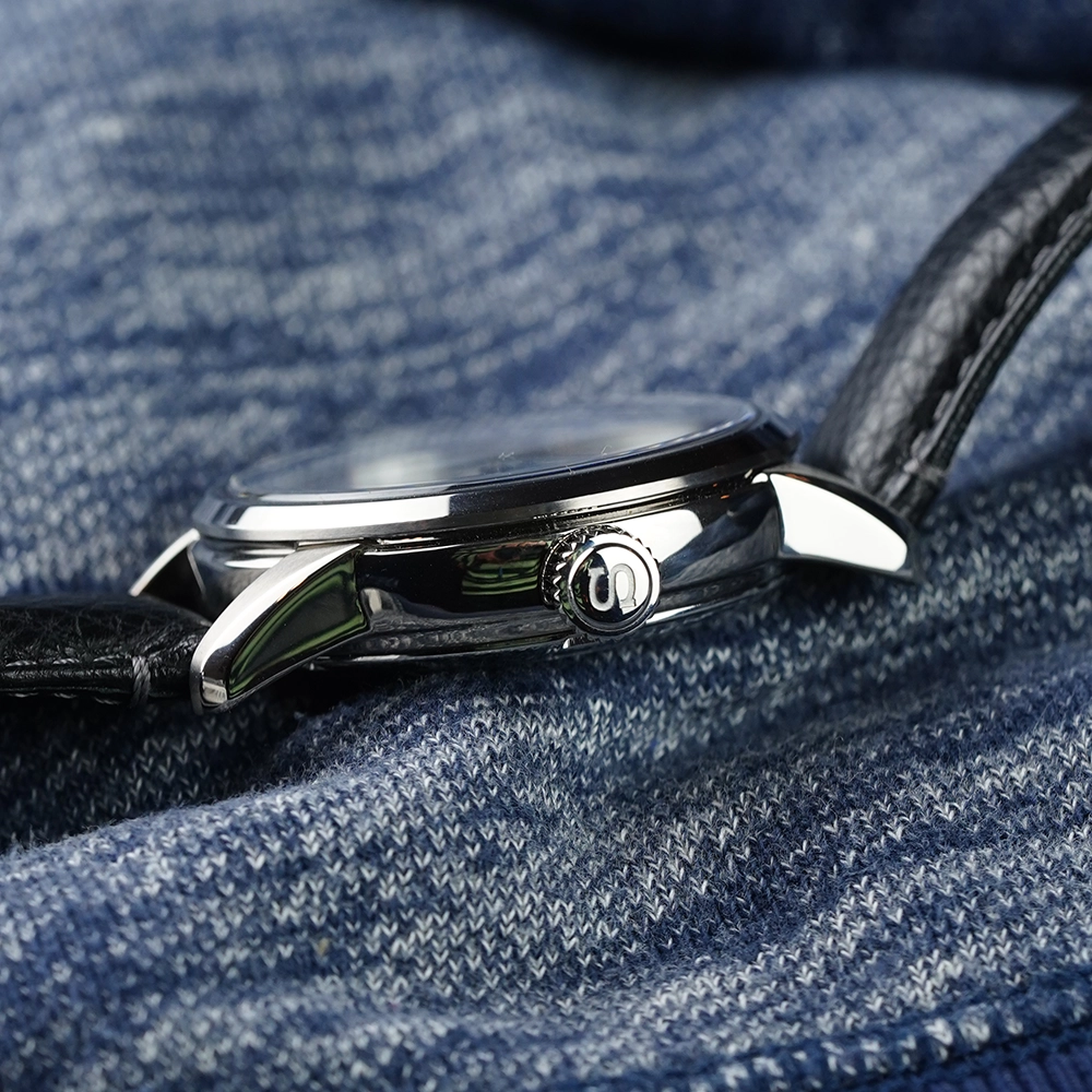Матеріал корпусу – нержавіюча сталь 316L з покриттям Diashield. Ремінець зі шкіри із застібкою-метеликом. Ширина ременя 20 мм. Циферблат захищає опукле сапфірове скло з покриттям антивідблиску. Задня кришка прозора.